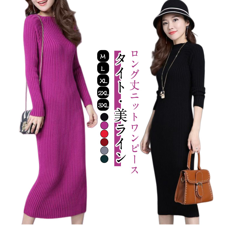 ニットワンピース レディース ロングワ ワンピース 続々登場 マゼンタ グリーン グレー ブラック ワイン レッド M L XL 2XL 3XL