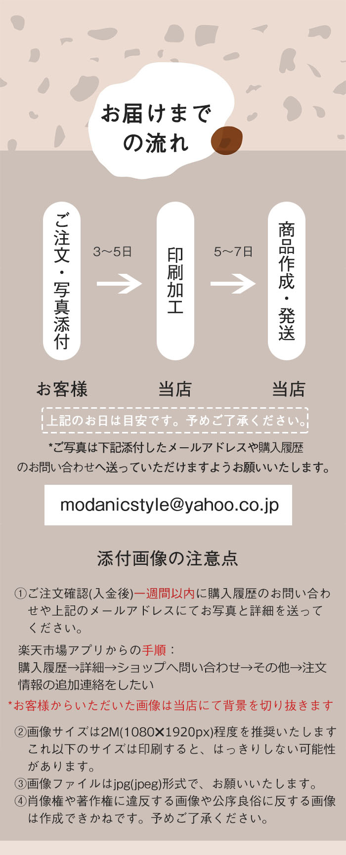 2.写真のご送付:ご注文後、お客様からペットや人物など、プリントをご希望される写真をお送りいただく必要がございます。