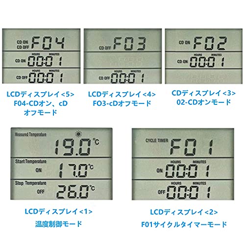 温度制御モード、F01サイクルタイマーモード、F02カウントダウンONモード、F03カウントダウンOFFモード、F04カウントダウンON、カウントダウンOFFモードの5つのモードから選択できます。 2つのモードを同時に動作させることはできないことに注意してください。システムは、現在表示されているモードでのみ動作します。タイミング機能と温度制御機能を同時に使用することはできません。