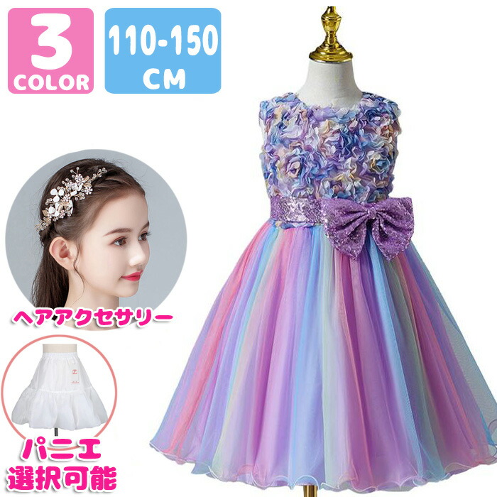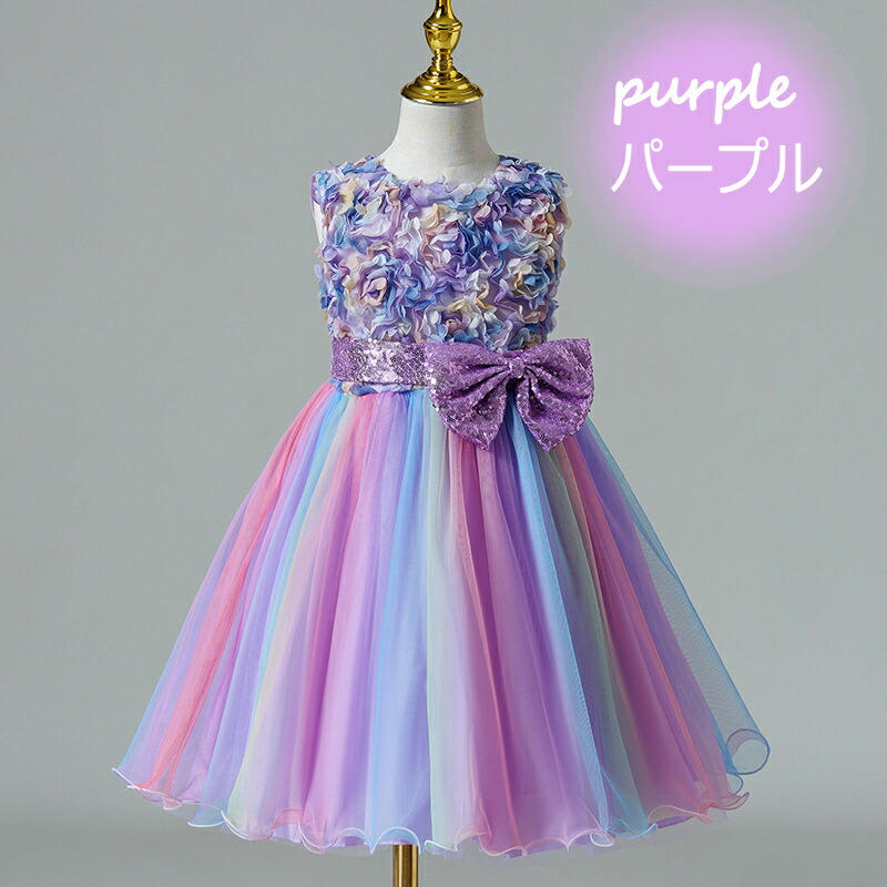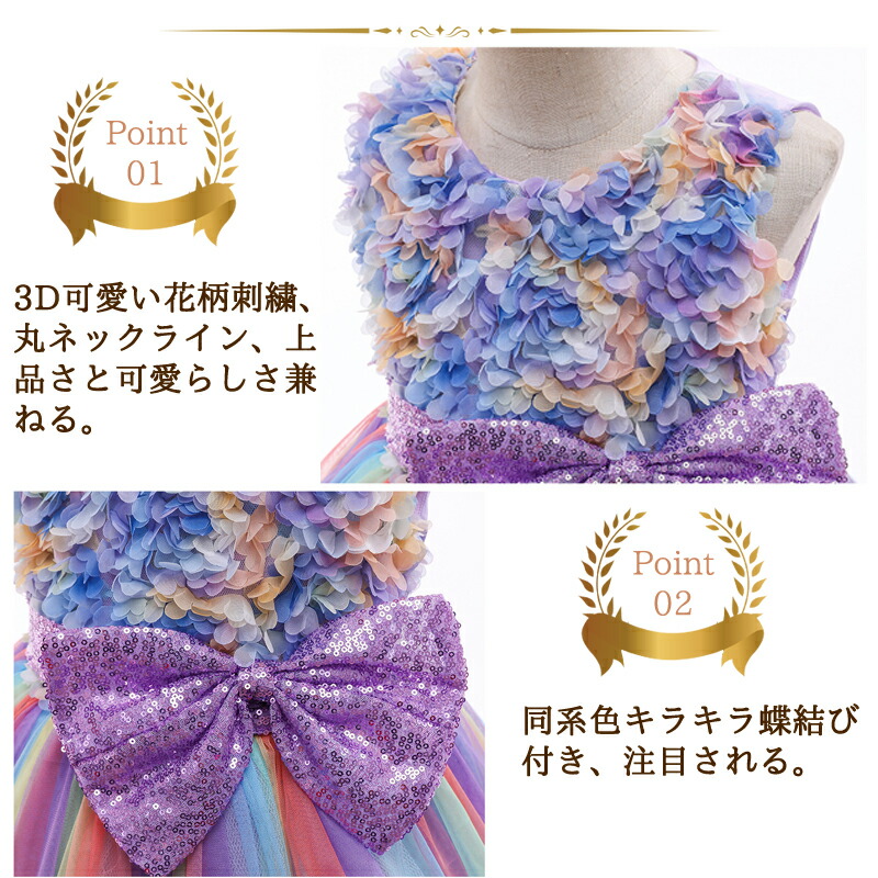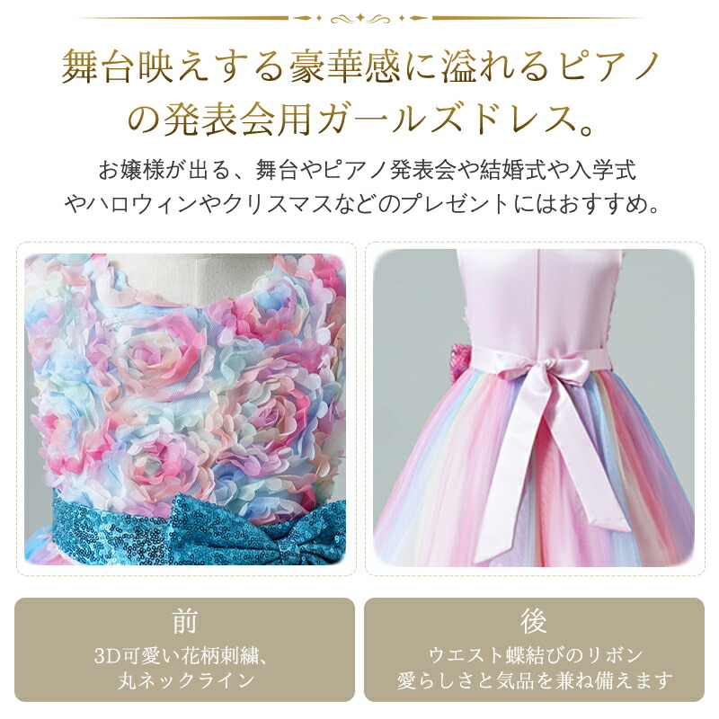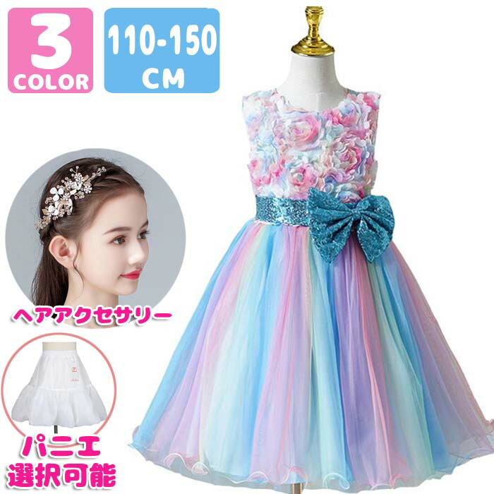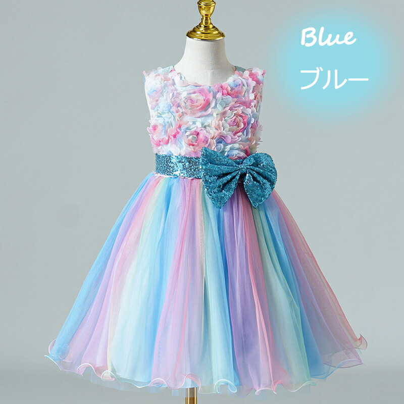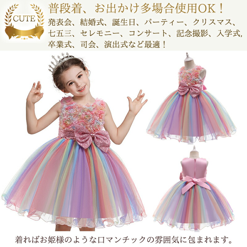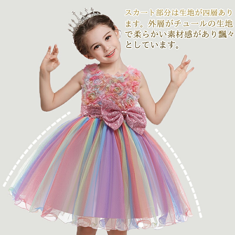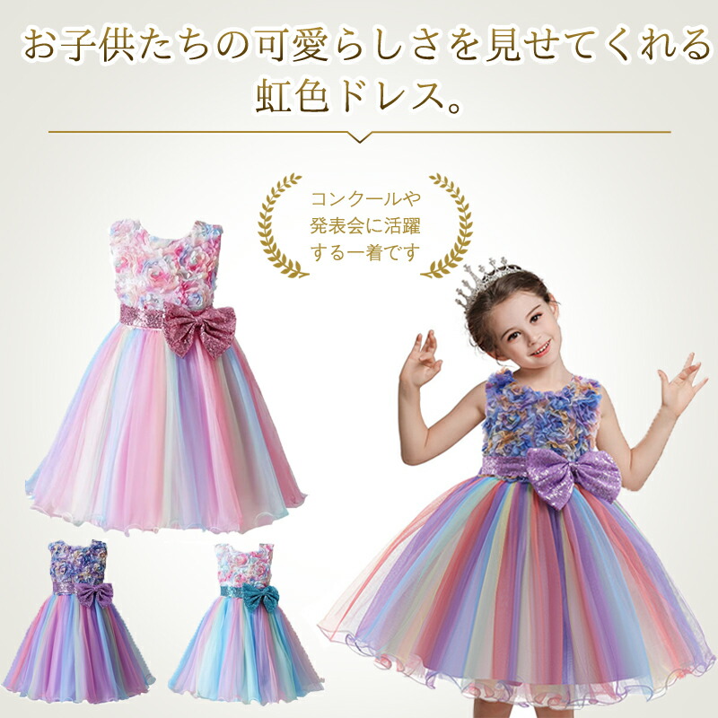 子供ドレス ピアノ 発表会 キッズドレス 110-150CM 虹色 ヘア飾り パニエ こども フォーマル パーティー 花柄 ベビードレス スバンコール フラワーガール レインボー 誕生日 リボンドレス