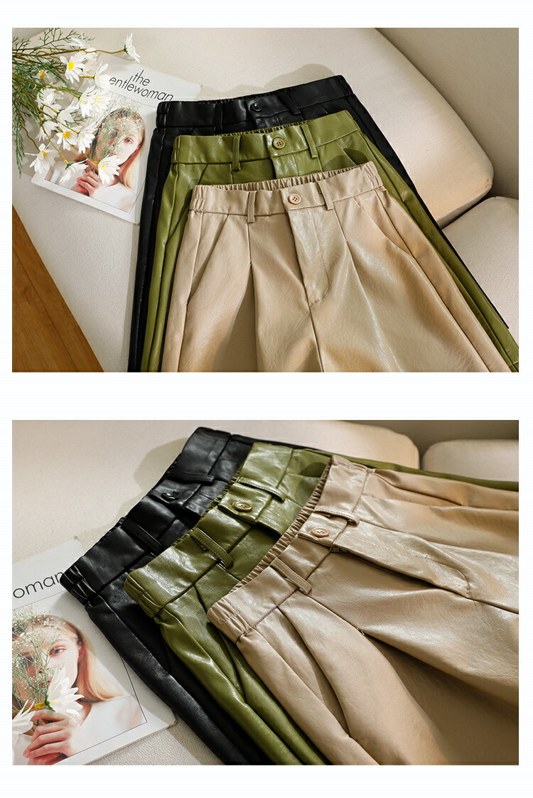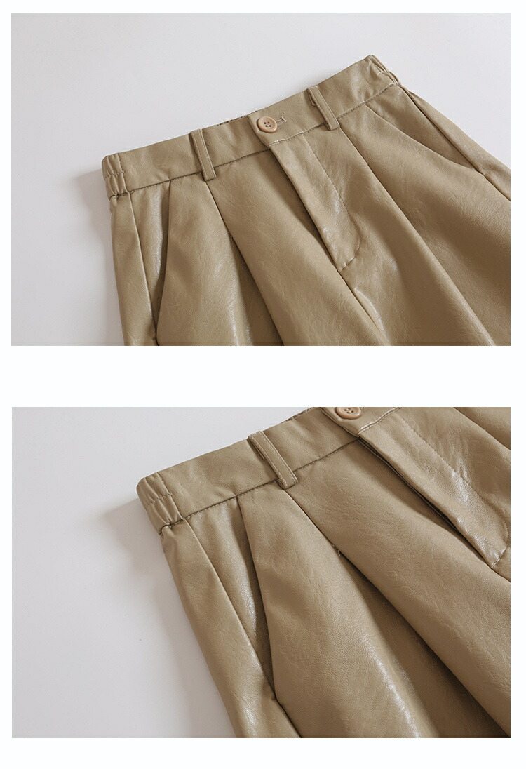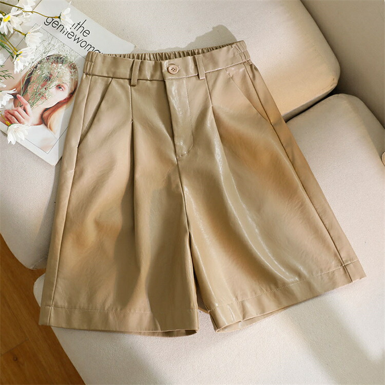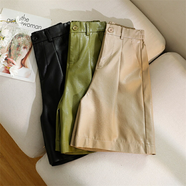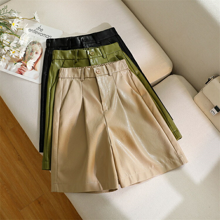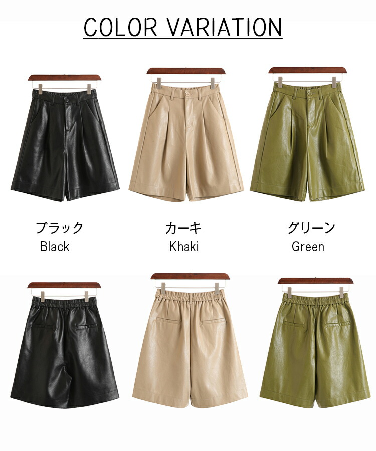 エコレザーショートパンツ ショートパンツ レディース ボトムス ハーフパンツ レザーパンツ タックパンツ 春 春夏 フェイクレザー 合皮 ウエストゴム 黒 グリーン 緑 ブラッ カーキ