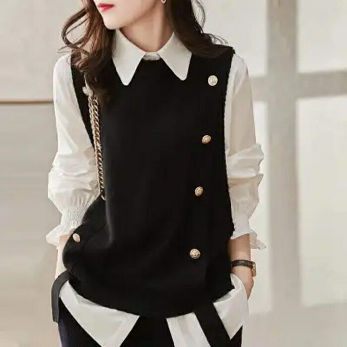 重ね着風 2点セット ニットベスト シ トップス ベスト 豊富な品揃え ブラック グレー コーヒー色