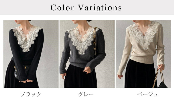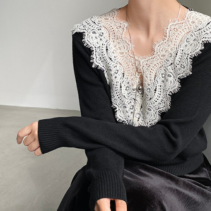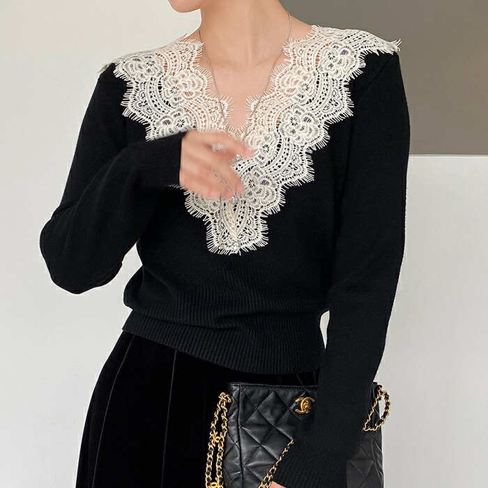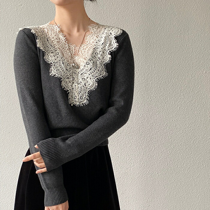 ニットセーター レディース Vネック 襟レースデザイン 花柄 きれいめ 上品 ニット ニットインナー トップス 長袖 セーター 長袖セーター プルオーバー ニットソー 秋 冬 ショート インナー