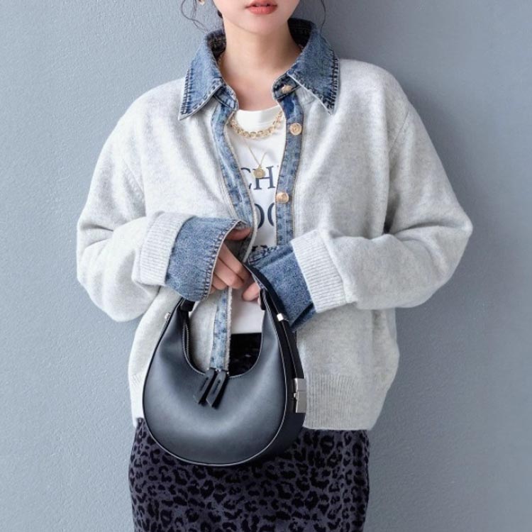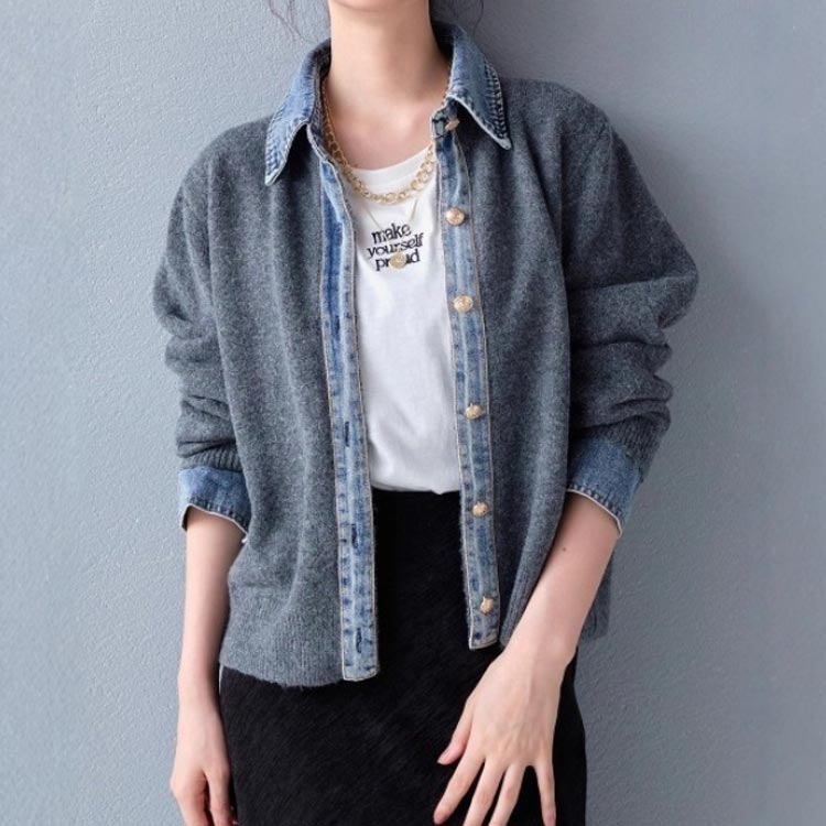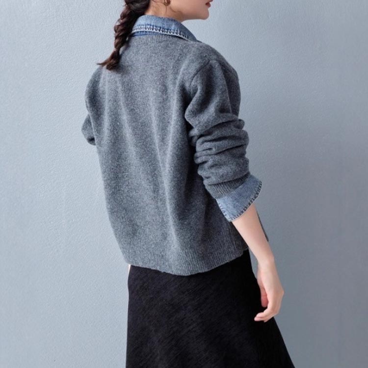 デニムシャツ風レイヤードニットトップス レディースファッション 豊富な品揃え ホワイト ダークグレー コーヒー ネイビー ライトグレー ワインレッド