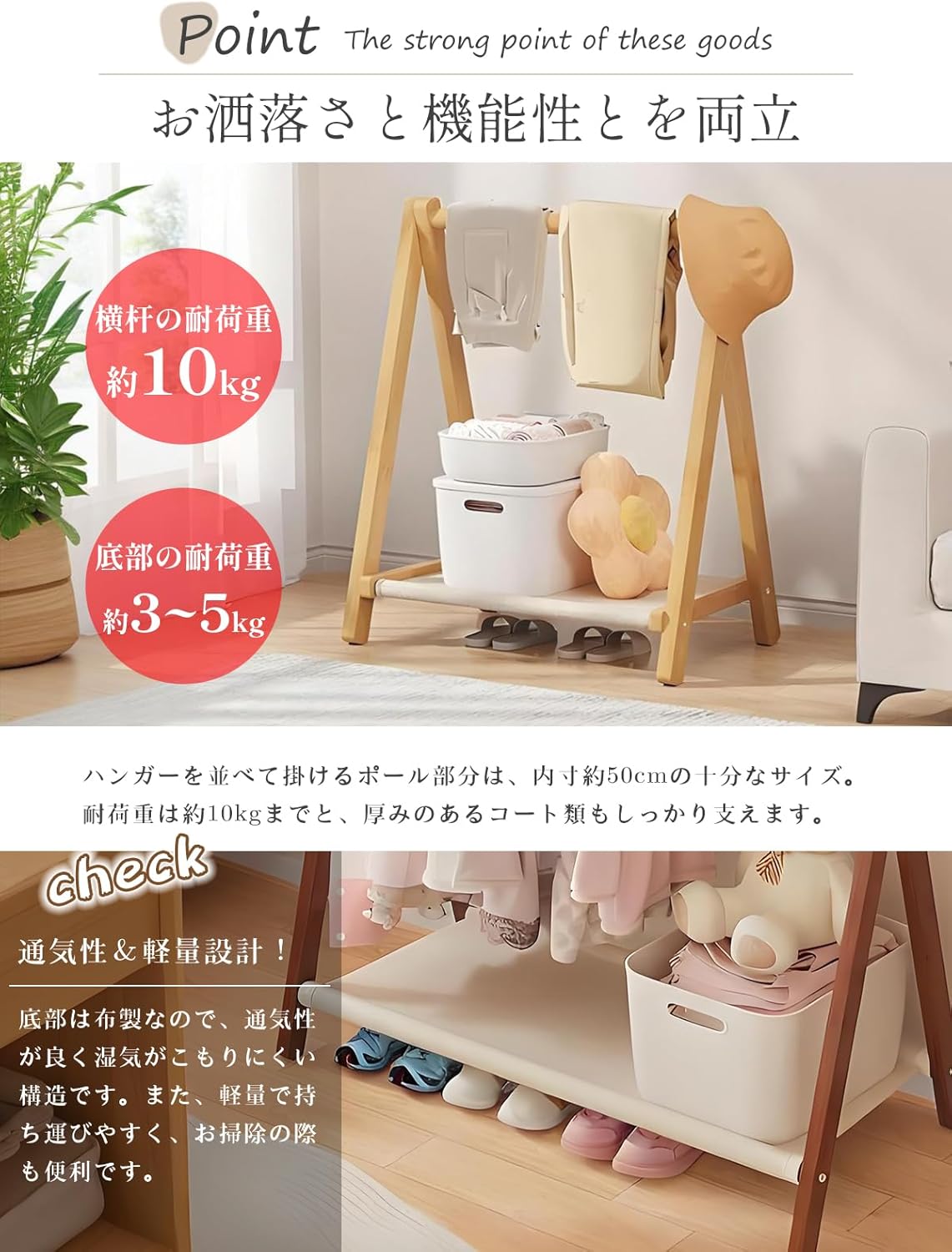 【おしゃれで機能的な木製ハンガーラック】 ナチュラルな木製のハンガーラックは、お子さまの服やカバンをすっきり整理できる収納アイテムです。シンプルなデザインで、どんな子ども部屋にも自然に溶け込み、お部屋をおしゃれに整えます。キッズ収納として、成長に合わせて長くお使いいただける商品です。