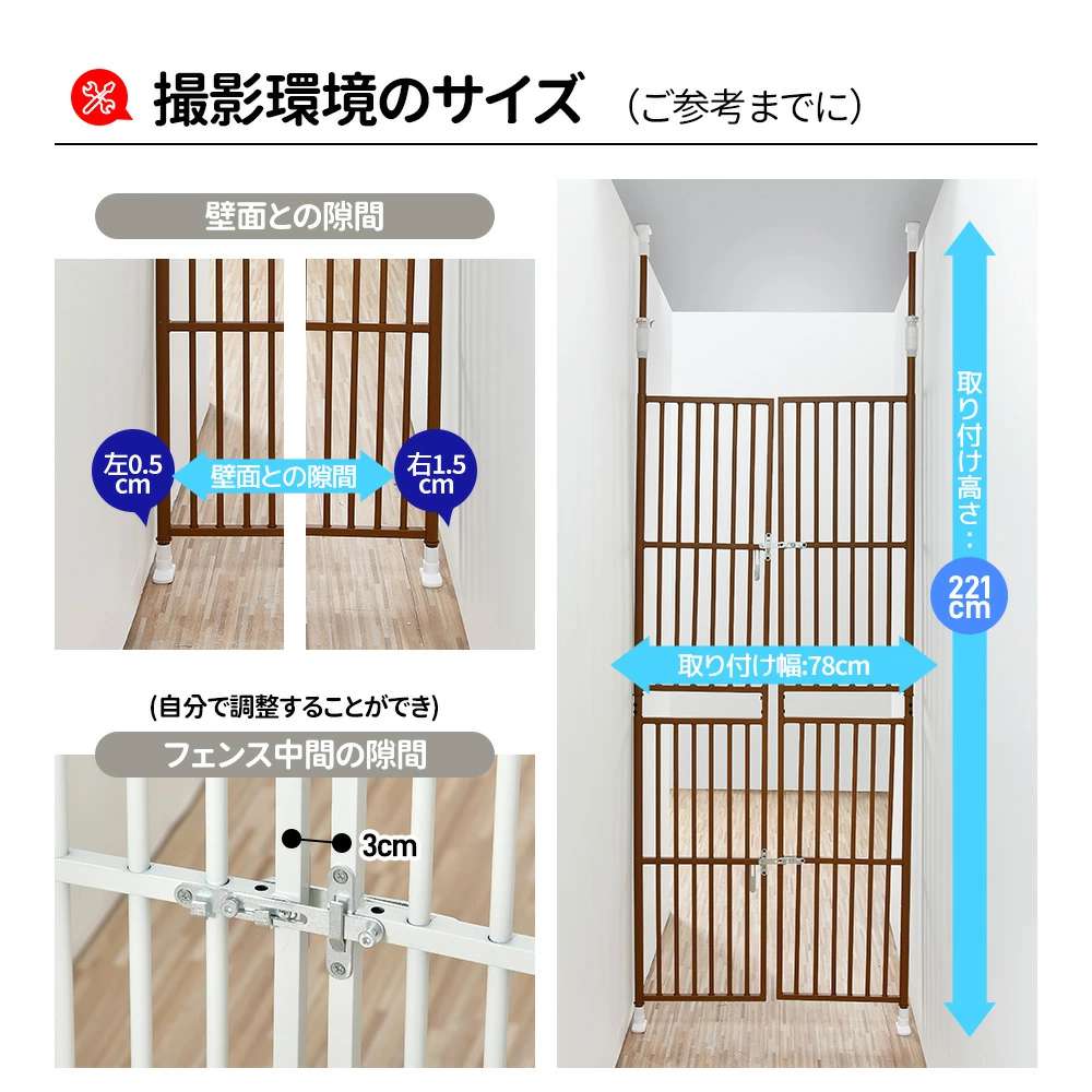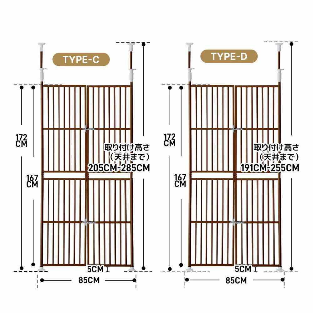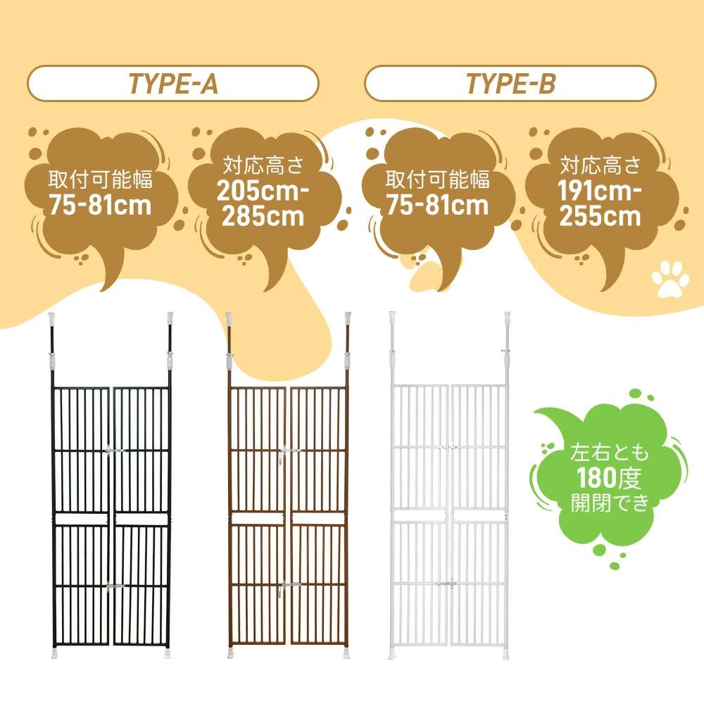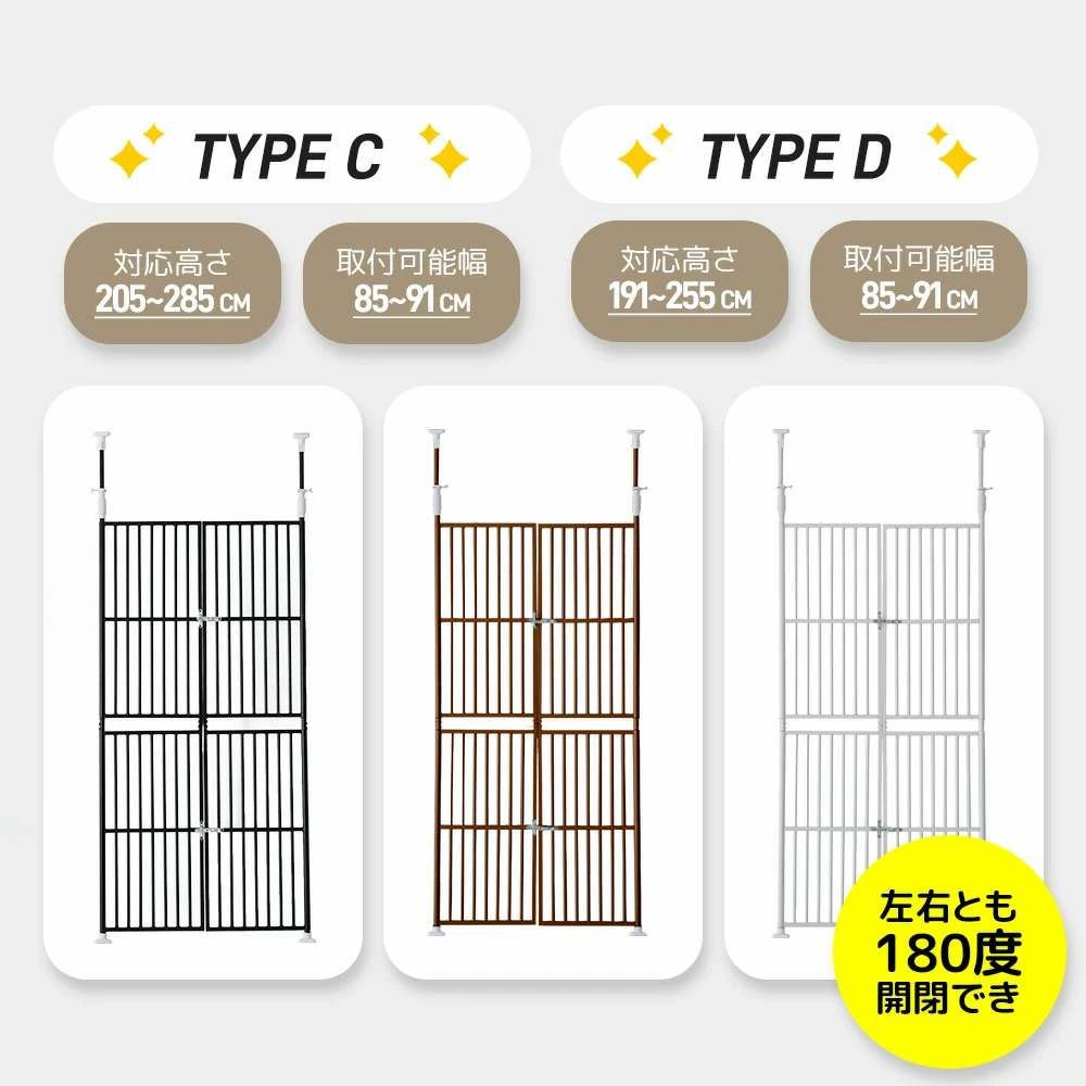 4サイズ選択可ぺットゲート 高さ調節 ペット ペットグッズ 新登場! TYPE A:高さ205~285cm 幅75~81cm TYPE B:高さ191~255cm 幅75~81cm TYPE C:高さ205~285cm 幅85~91cm TYPE D:高さ191~255cm 幅85~91cm ブラウン ホワイト ブラック