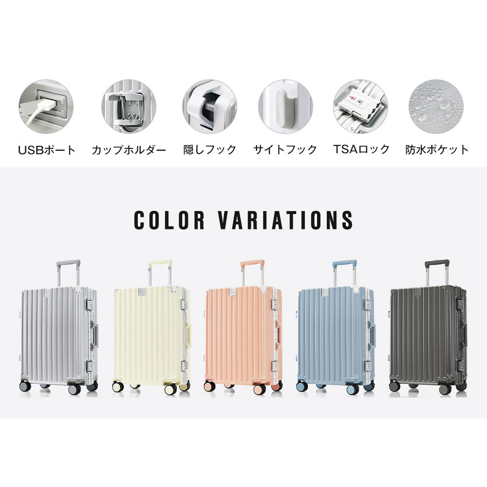 スーツケース キャリーケース キャリーバッグ S M L サイズ フレームタイプ 機内持ち込み アルミ USBポート付き カップホルダー フック式底足 ドリンクホルダー おしゃれ 静音 海外 超軽量