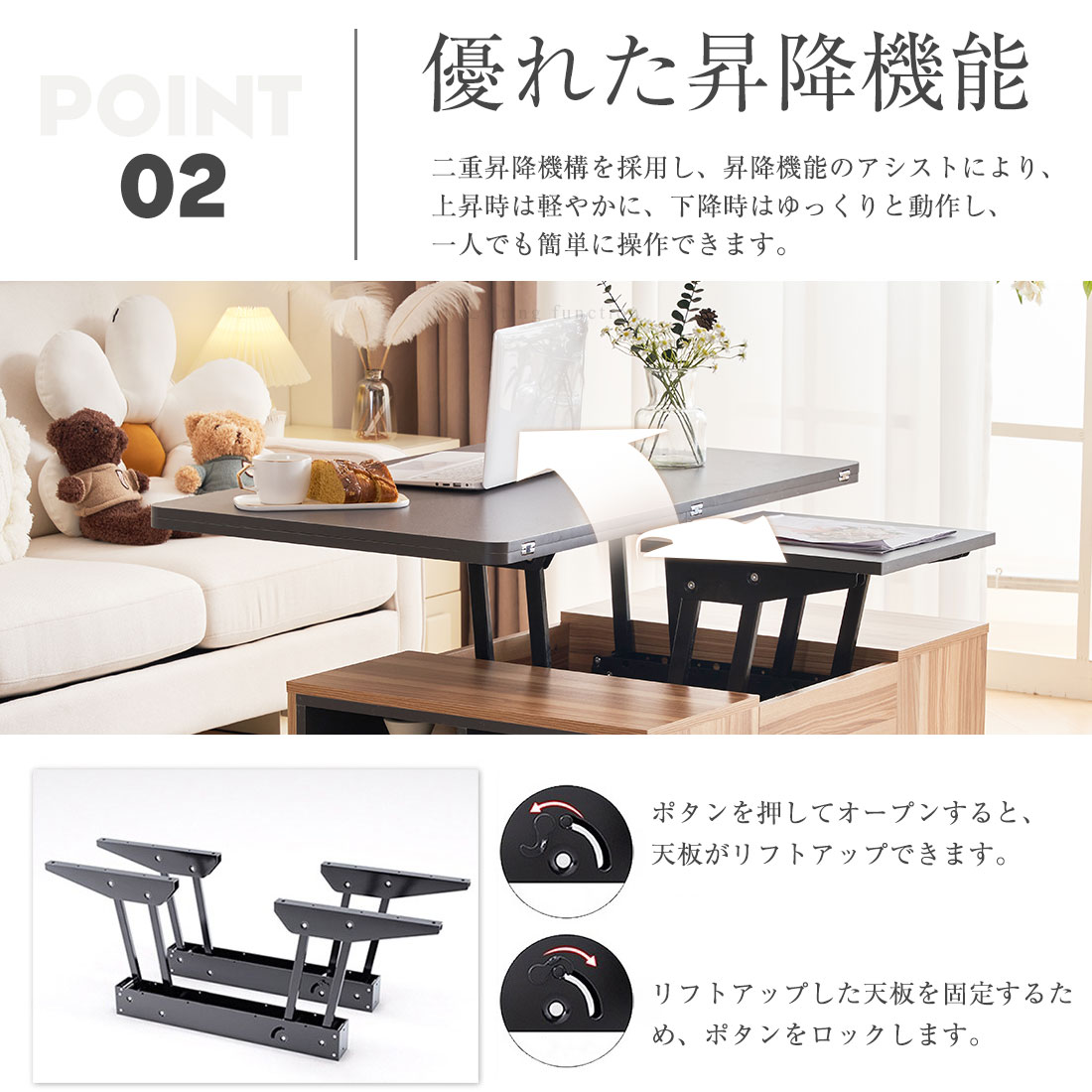 センターテーブル 昇降式 収納付き 幅