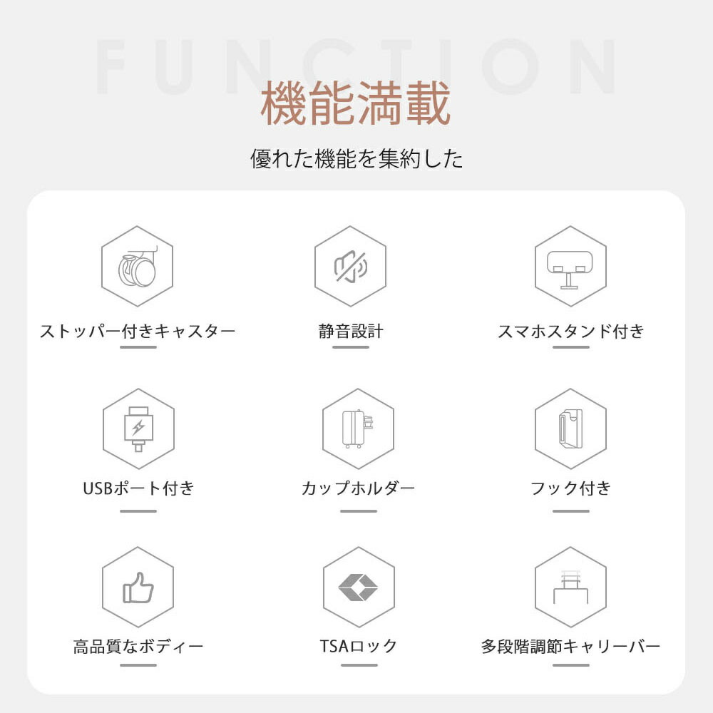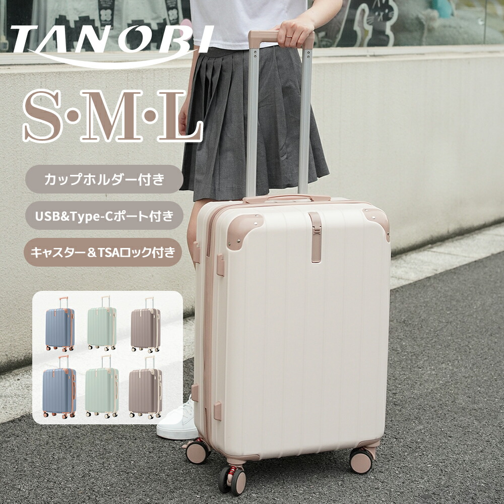 スーツケース USBポート TANOBI キャリーバッグ ストッパー付き キャリーケース カップホルダー スマホスタンド 超軽量 ファスナー式 TSAロック搭載 可愛い 2~14泊 小 フック機能付き
