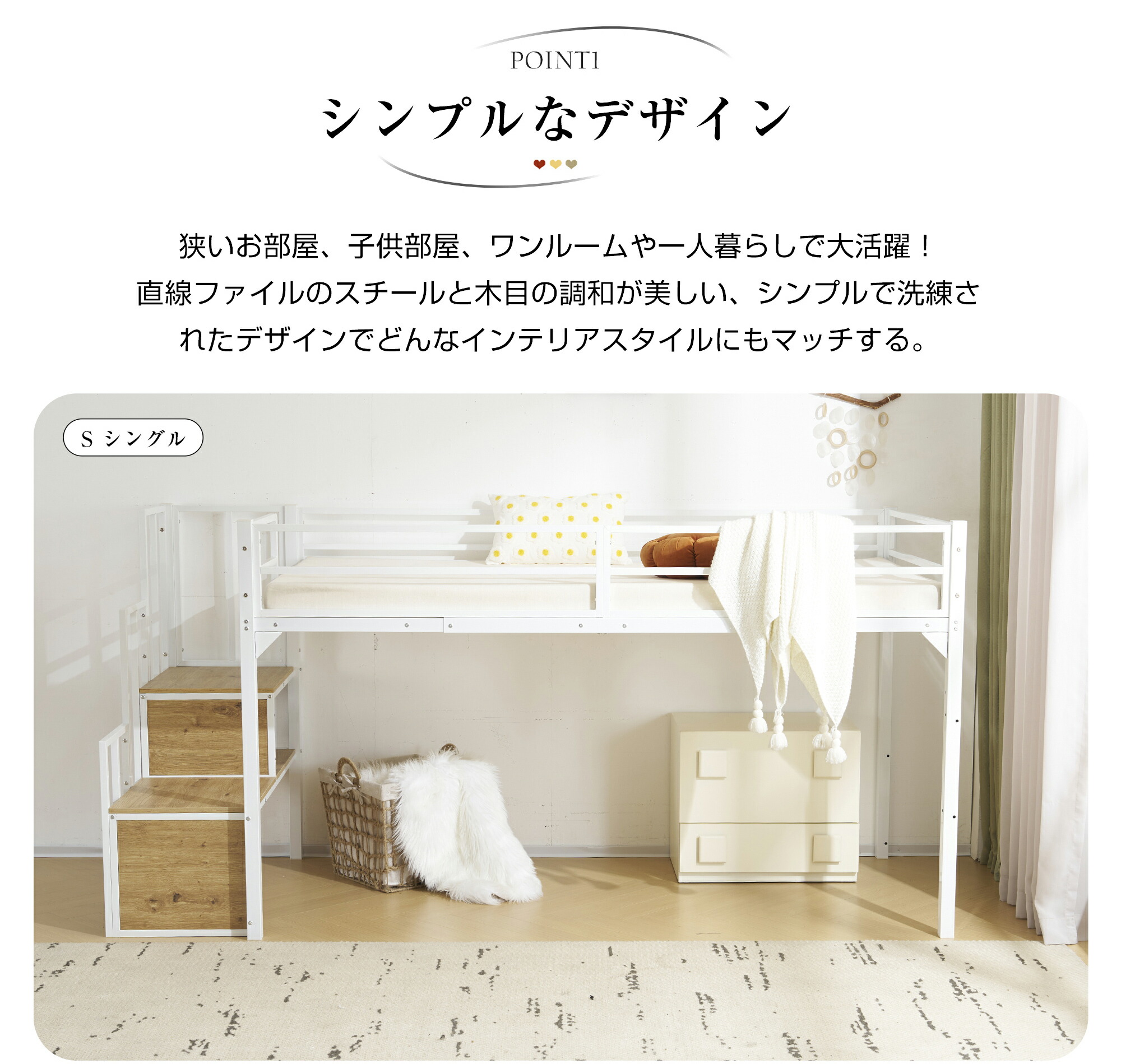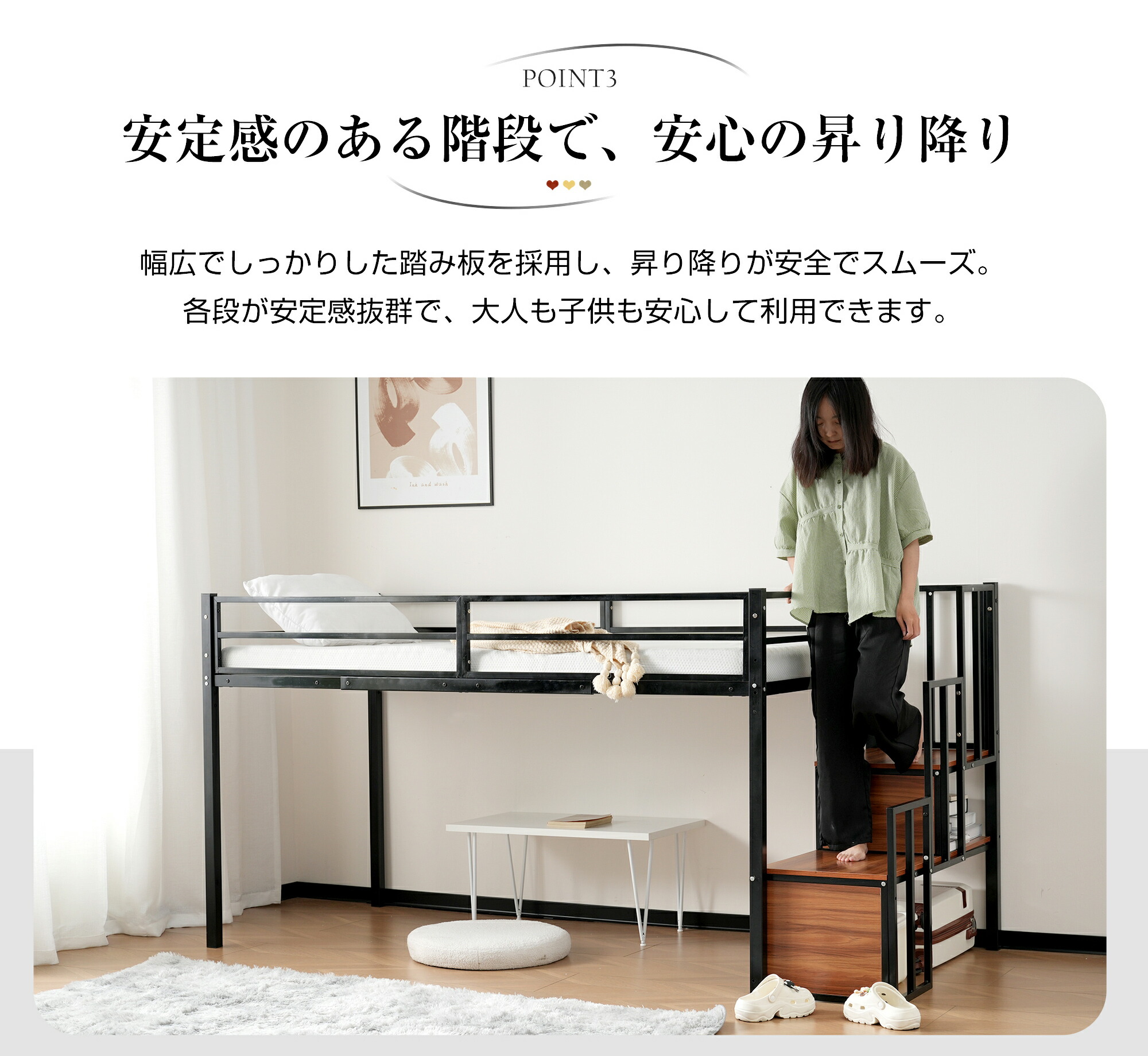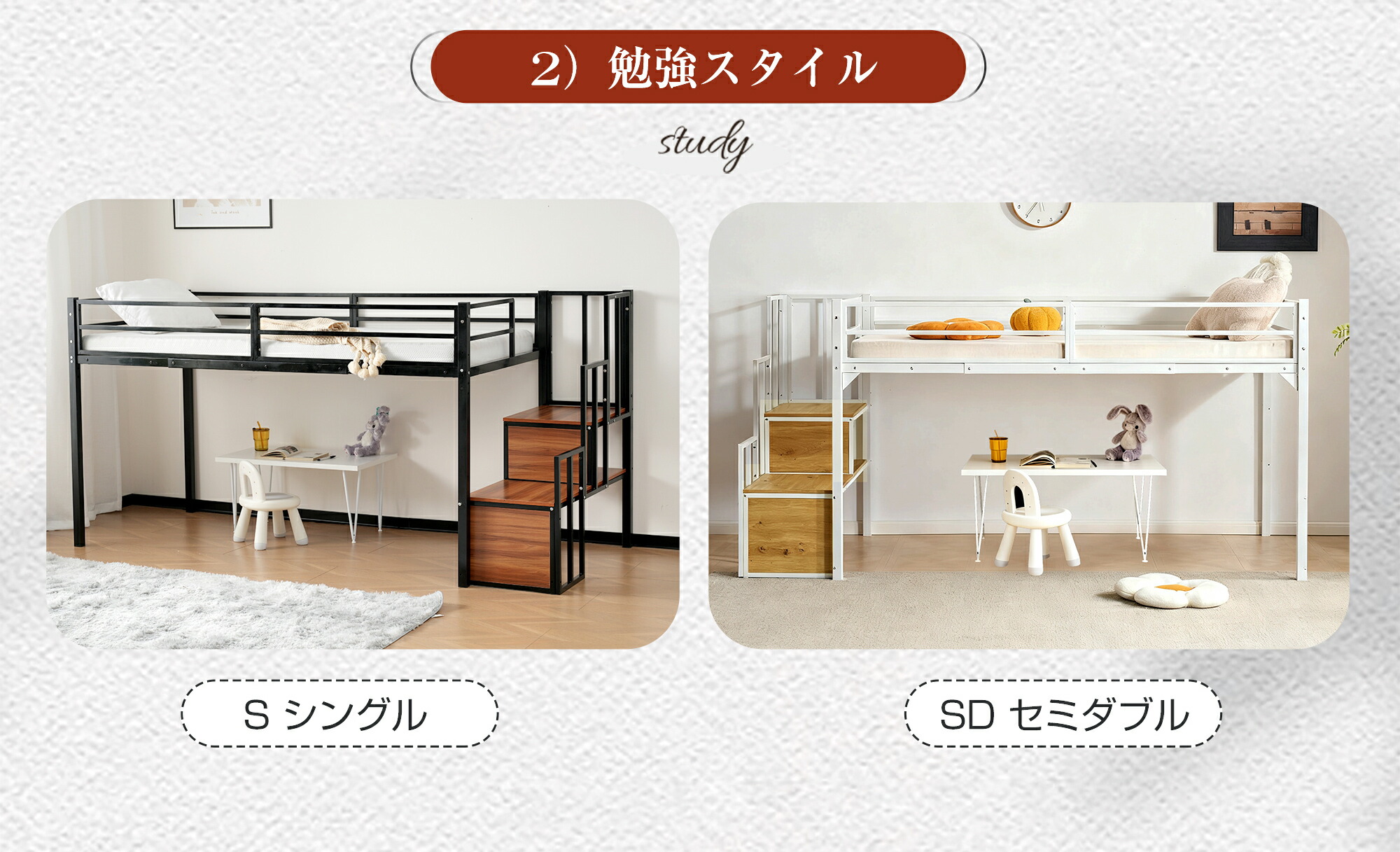 ロフトベッド 階段付き パイプベッド シングル セミダブル ブラック ホワイト