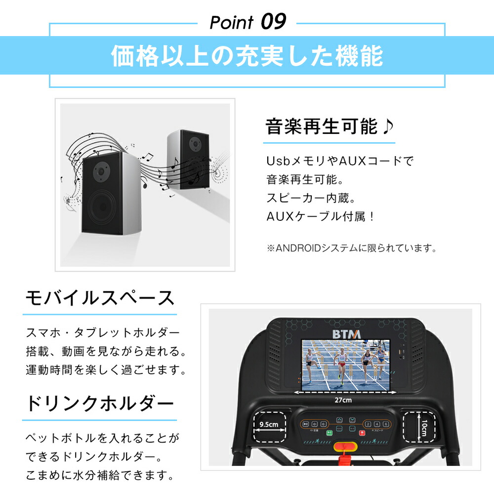 電動ランニングマシン MAX14km h ルームランナー BTM フィットネスマシーン 傾斜角度4段 有酸素運動 静音 折りたたみ 家庭用 エクササイズ 衝撃吸収 室内運動 トレッドミル
