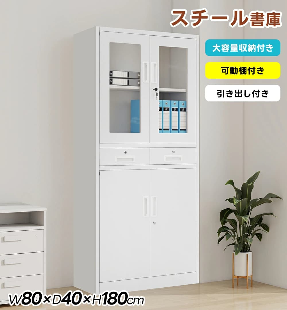 スチール書庫 両開き書庫 キャビネット 引き出し付き 可動棚 A4対応 幅80 高さ180cm 書類保管庫 大容量収納 鍵付き 書庫 多用途 保管庫 書類 収納 物品棚 オフィス 業務用 収納棚