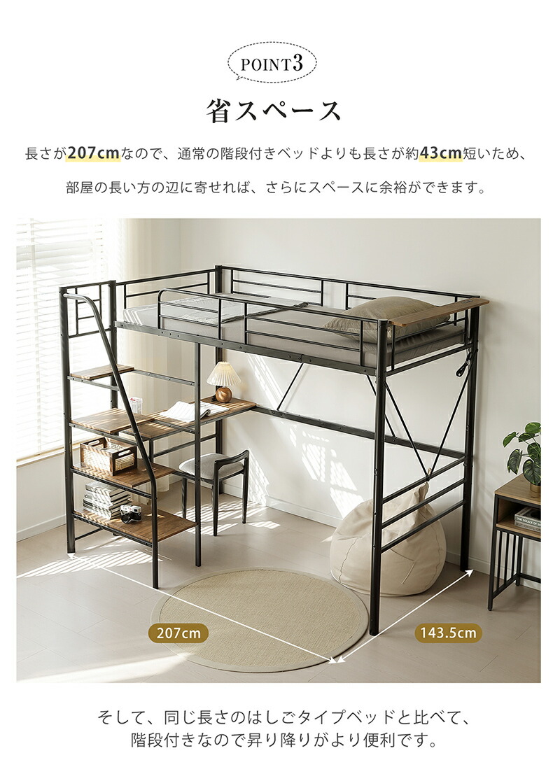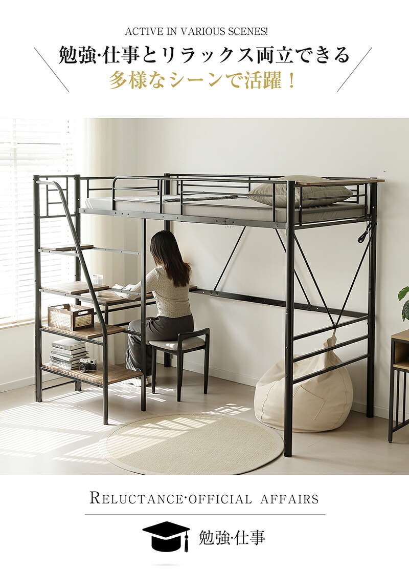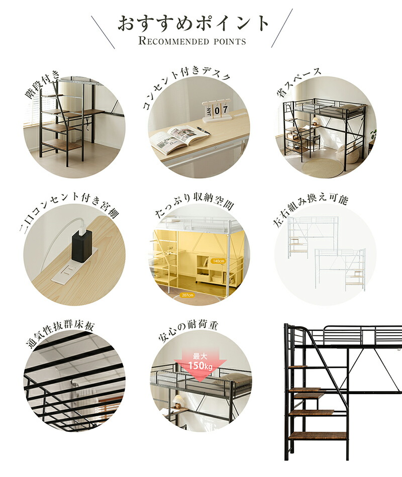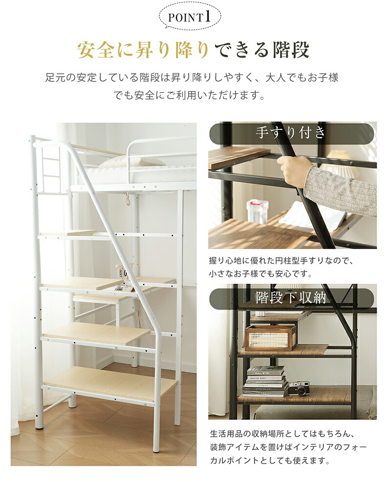 ロフトベッドシングル 階段式 パイプベ ブラック ホワイト
