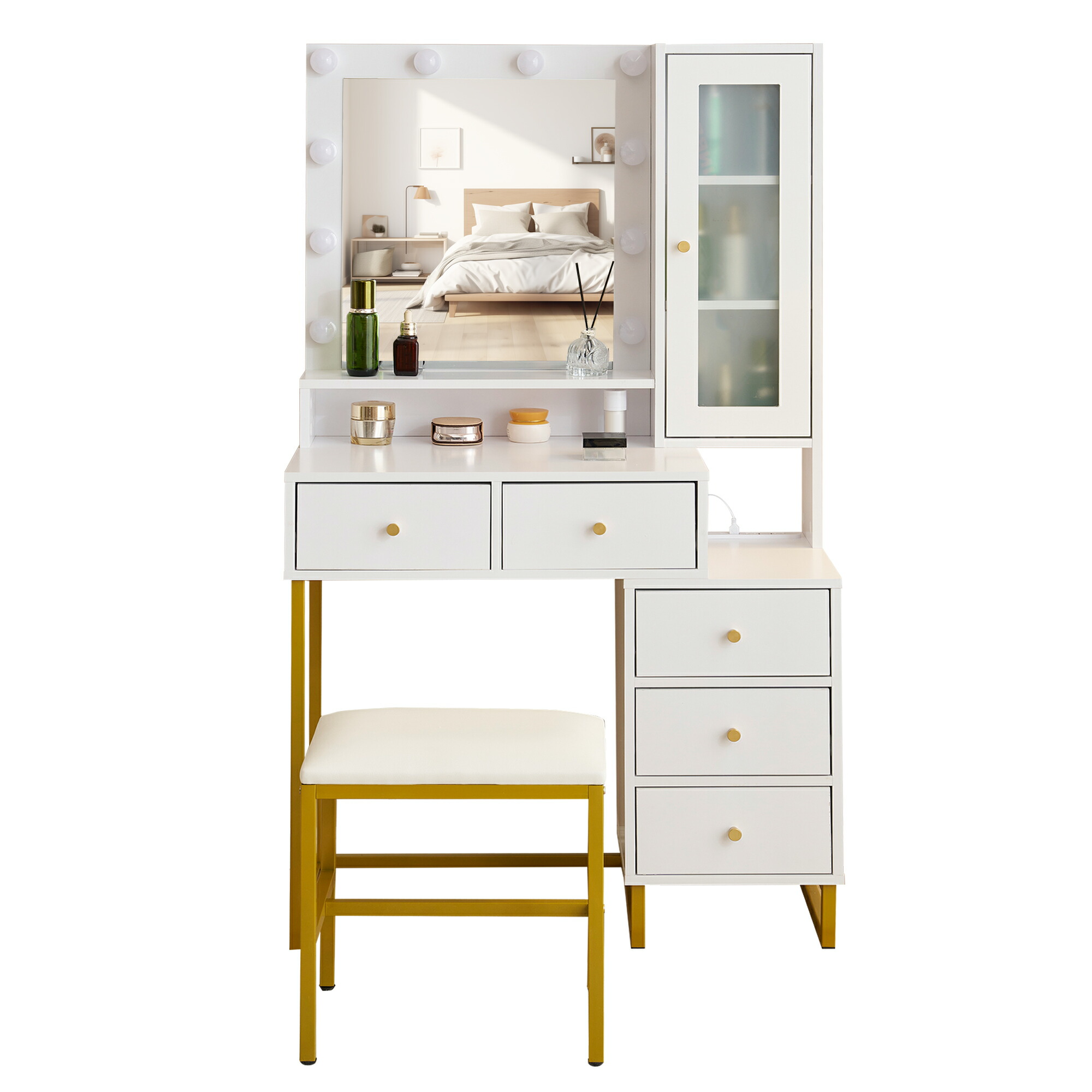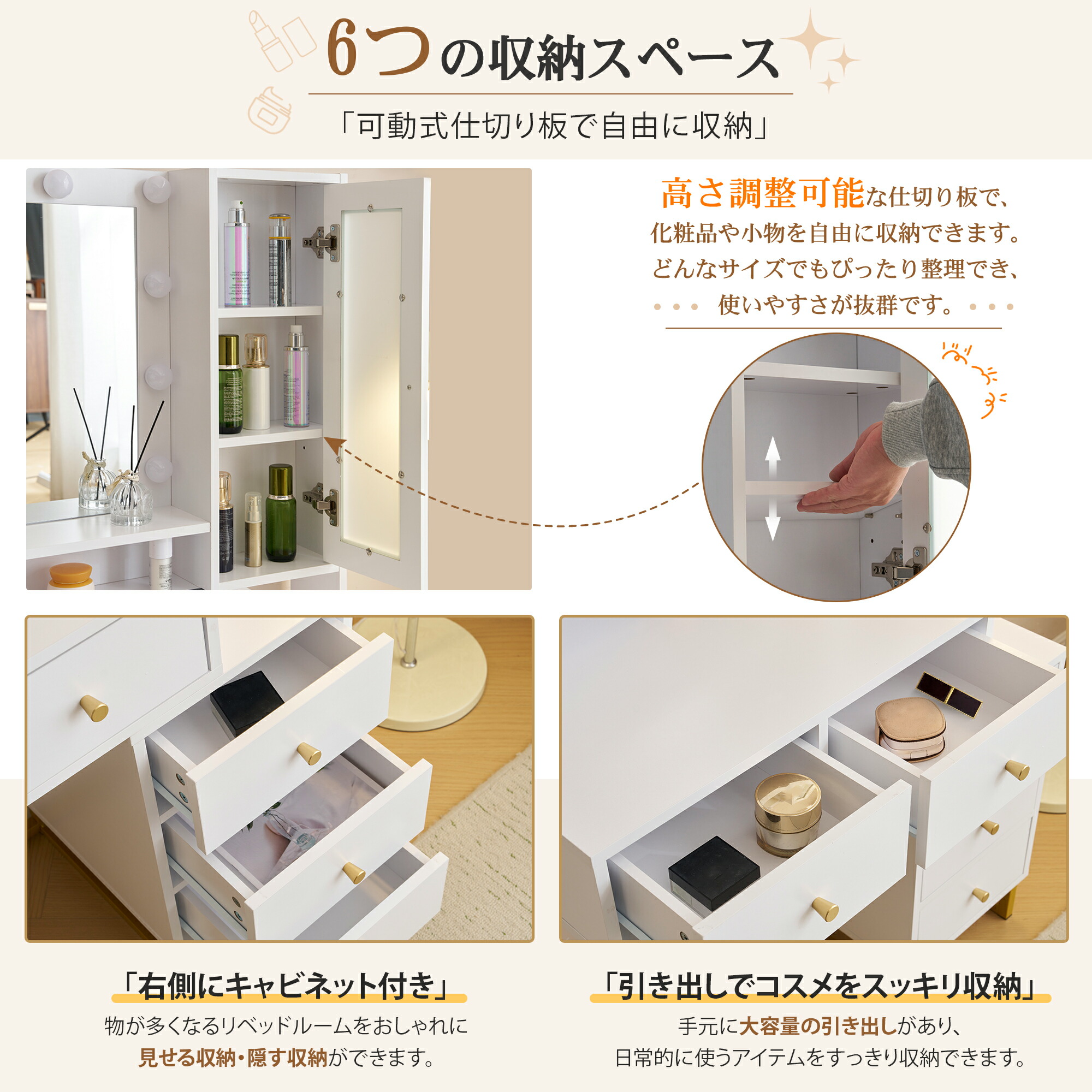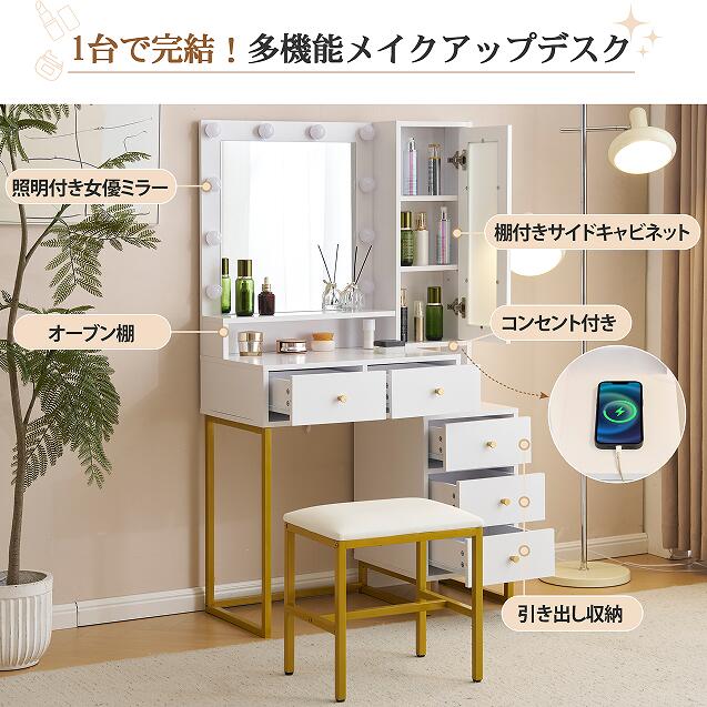 ドレッサー 化粧台 LEDライト付き ドレッサーセット コンセント付き 鏡台収納棚 引き出し付き LEDミラー スツール付き 女優ミラー コンパクト デスク 可愛い メイク台 化粧 収納