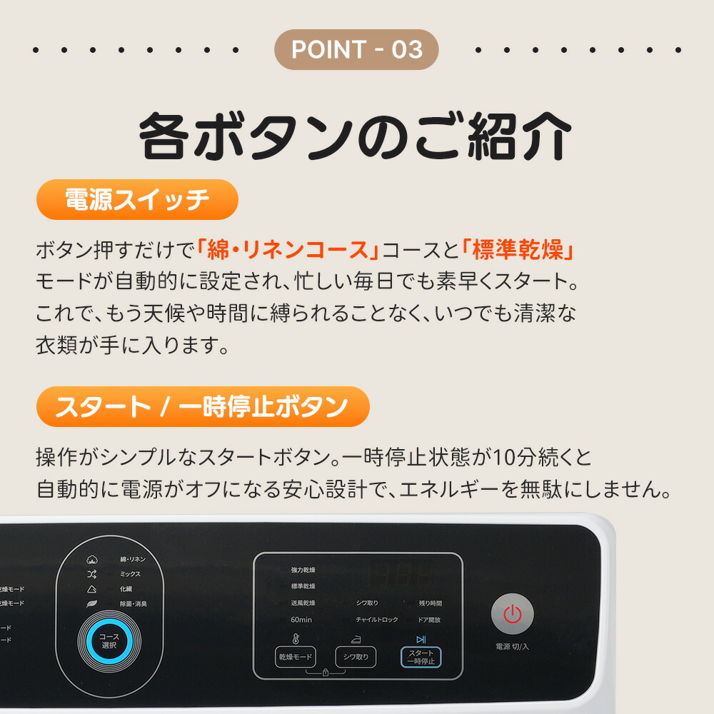 ※こちらの商品は家庭用乾燥機です。業務用ではありませんので宿泊施設やスポーツジム等、不特定多数の方が使用される場所での利用の場合は1年保証の対象外となります。
