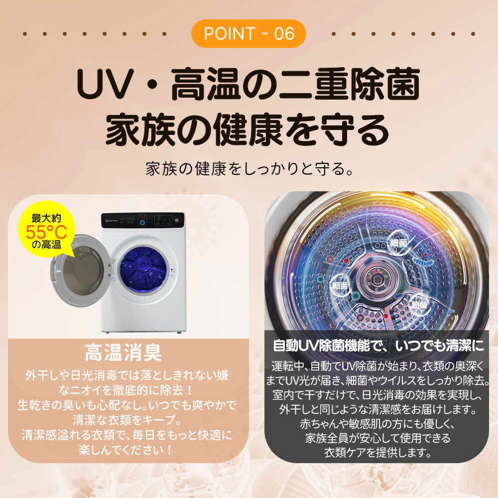 検索キーワード:【UV 高温除菌】SENTERN 衣類乾燥機 8kg 家庭用 大容量 大型 乾燥機 自動乾燥 温度調節 除湿 高温除菌 シワ取り 布団乾燥 アイロン 静音 チャイルドロック ドラム式 湿気対策 梅雨対策 カビ対策 花粉対策 PSE認証済み