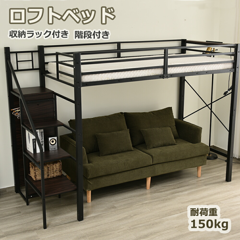 ロフトベッド パイプベッド シングル 高さ170cm コンセント付き 耐荷重150kg システムベッド コンパクト 収納付き ラック棚付き おしゃれ 省スペース 子供部屋 北欧