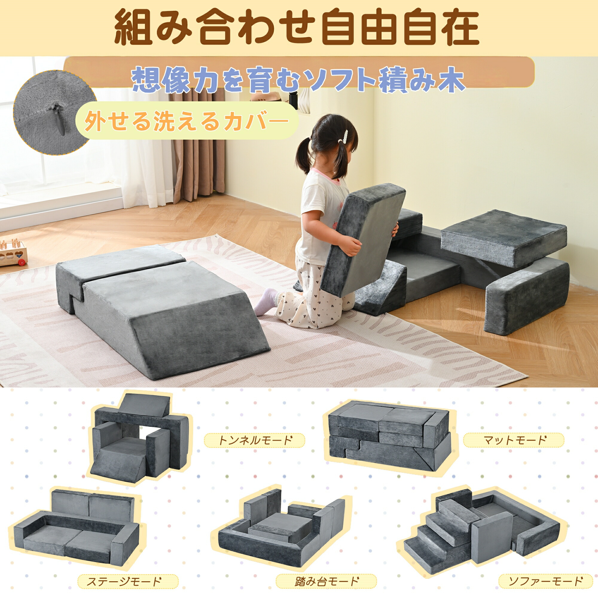 つみきソファ ソフトブロック 積み木クッション 8点セット キッズソファ アスレチック ブロック クッション 滑り台 すべりだい 玩具 自由組合 多機能 大型 室内 キッズスペース 子供 こど 遊具