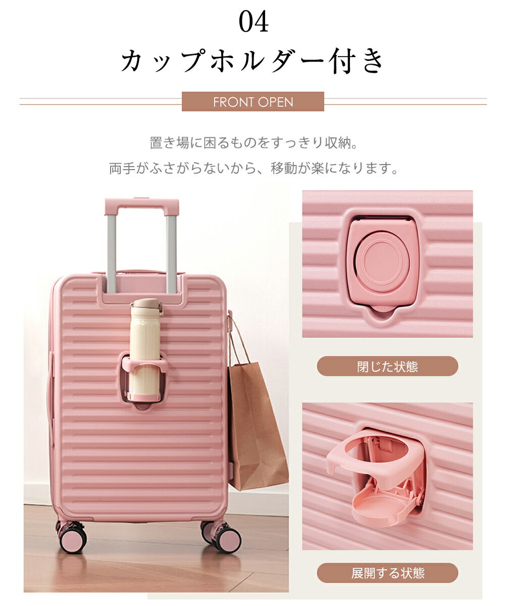 スーツケース フロントオープン 機内持ち込み キャリーバッグ Sサイズ MSサイズ USBポート付き ドリンクホルダー付き かわいい ストッパー付き ダブルキャスター 軽量 女性 修学旅行 頑丈 静か