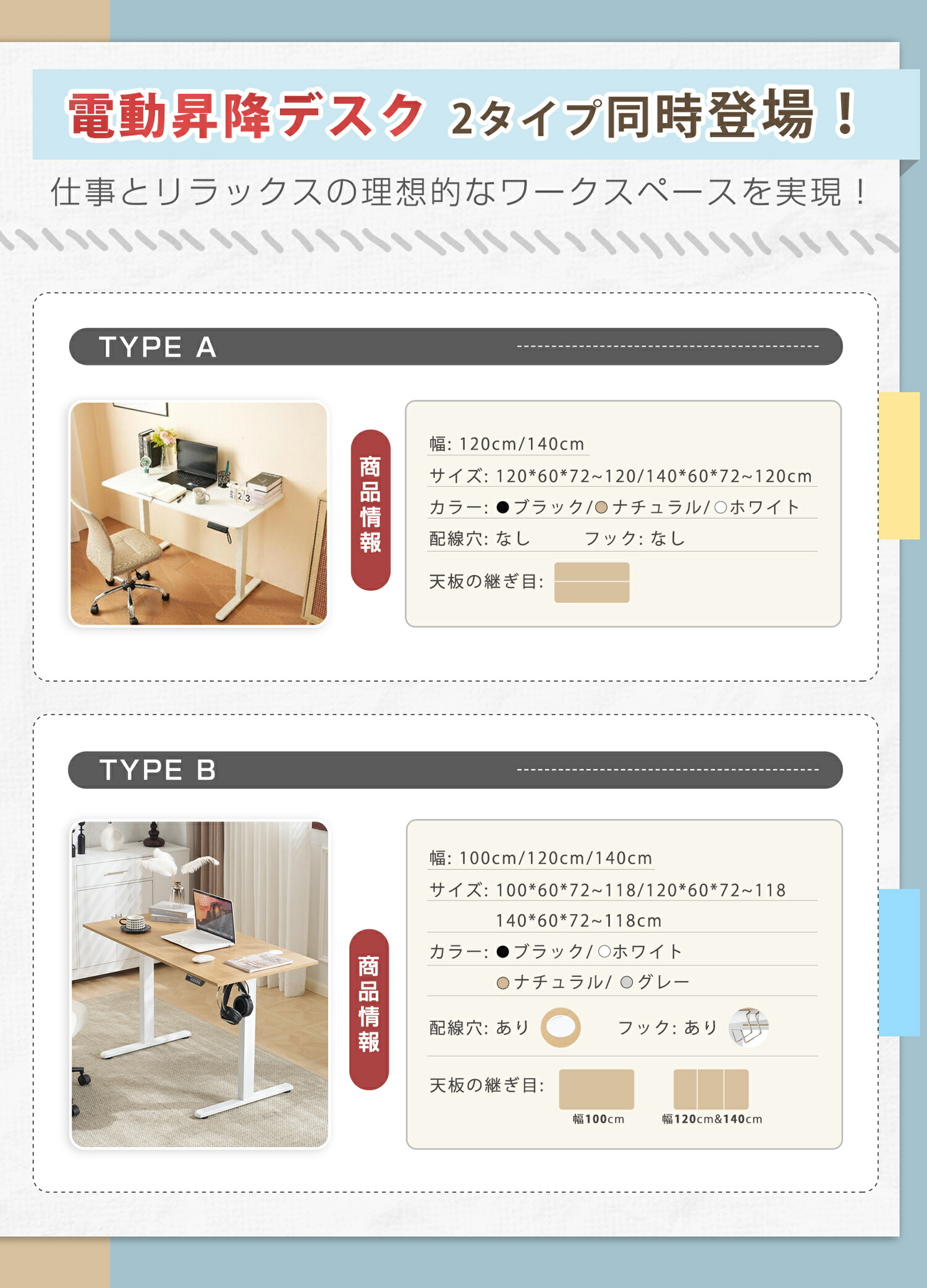 電動昇降デスク スタンディングデスク TYPE A TYPE B 100cm 120cm 140cm