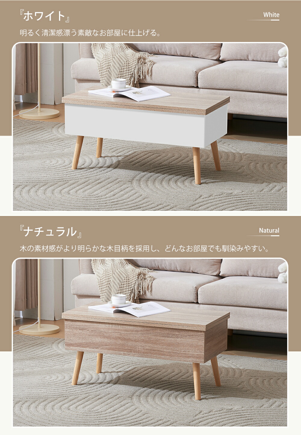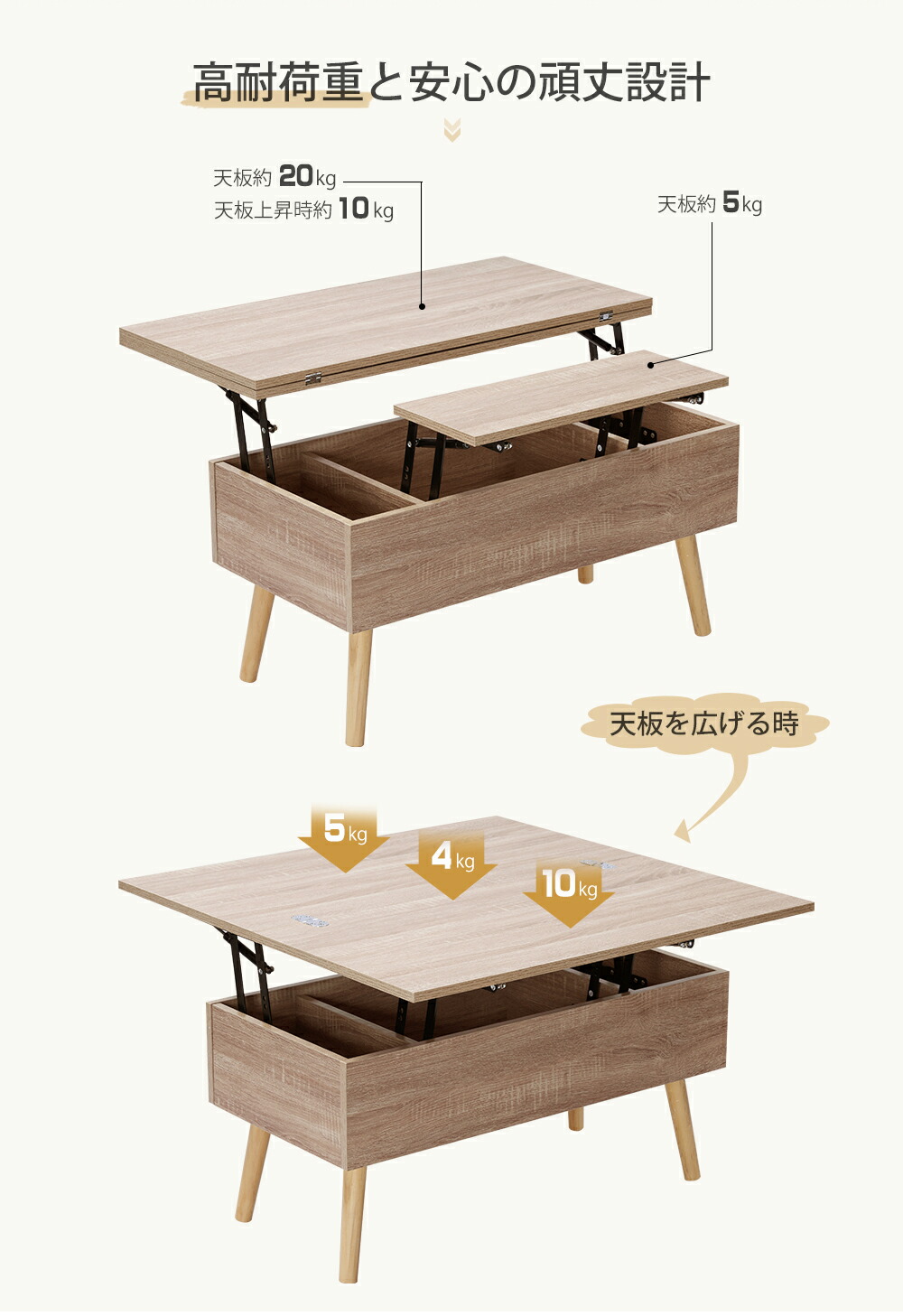 テーブル 油圧昇降式テーブル 昇降テー ナチュラル+ホワイト ナチュラル