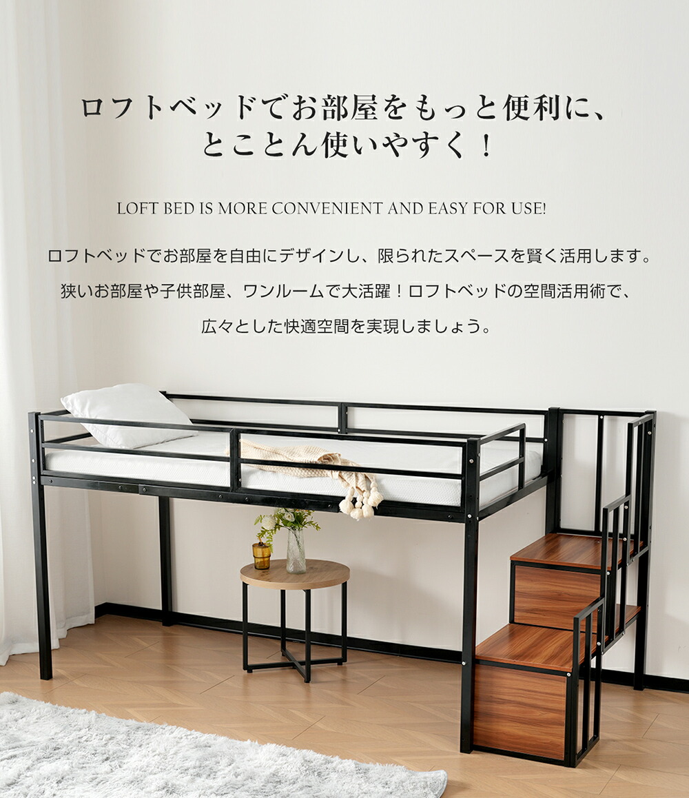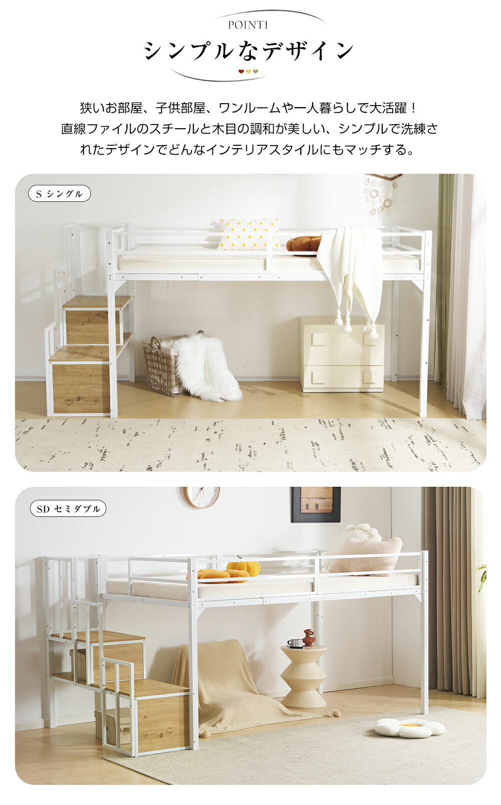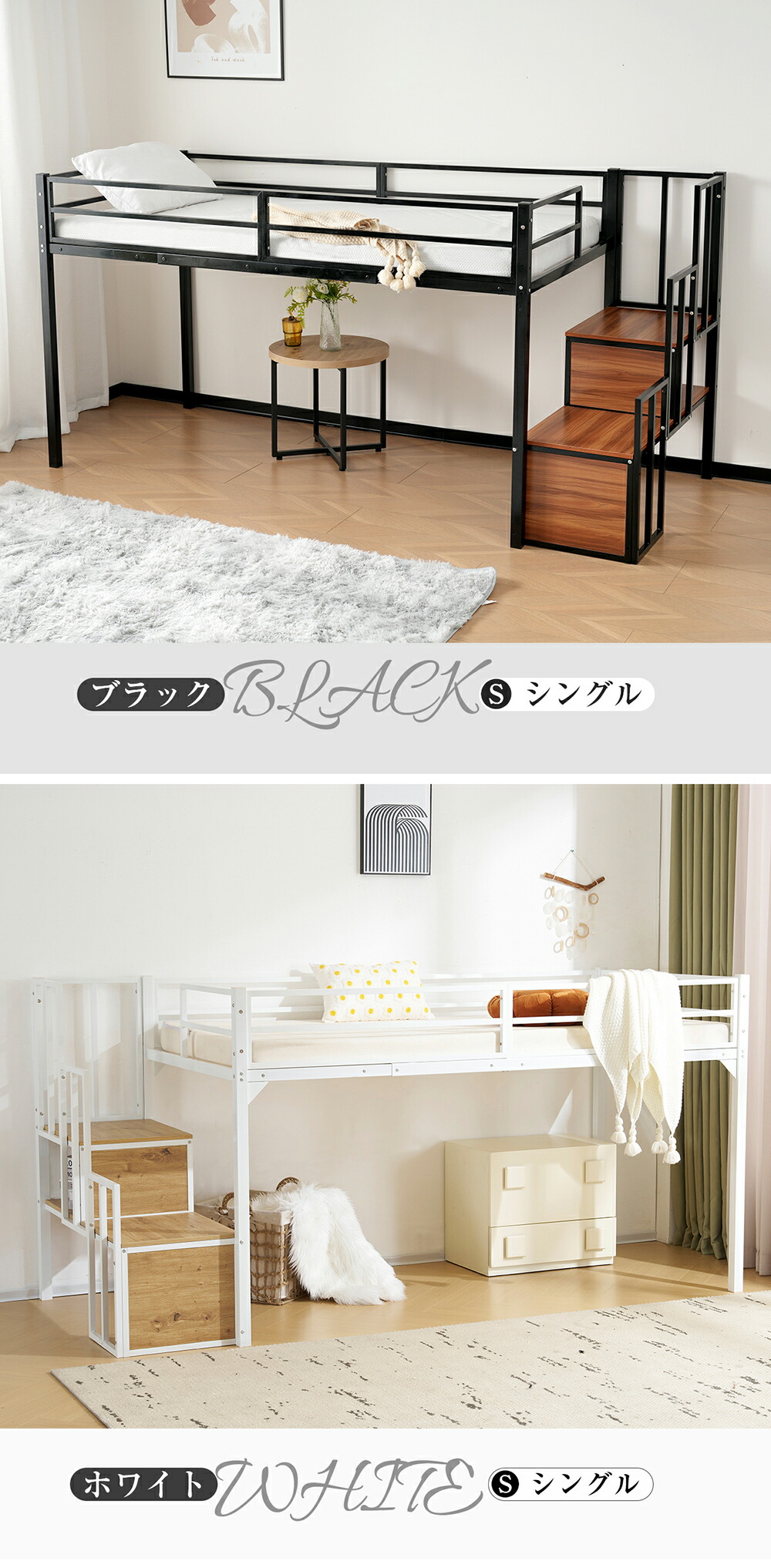 ロフトベッド パイプベッド 階段付き シングル セミダブル ブラック ホワイト