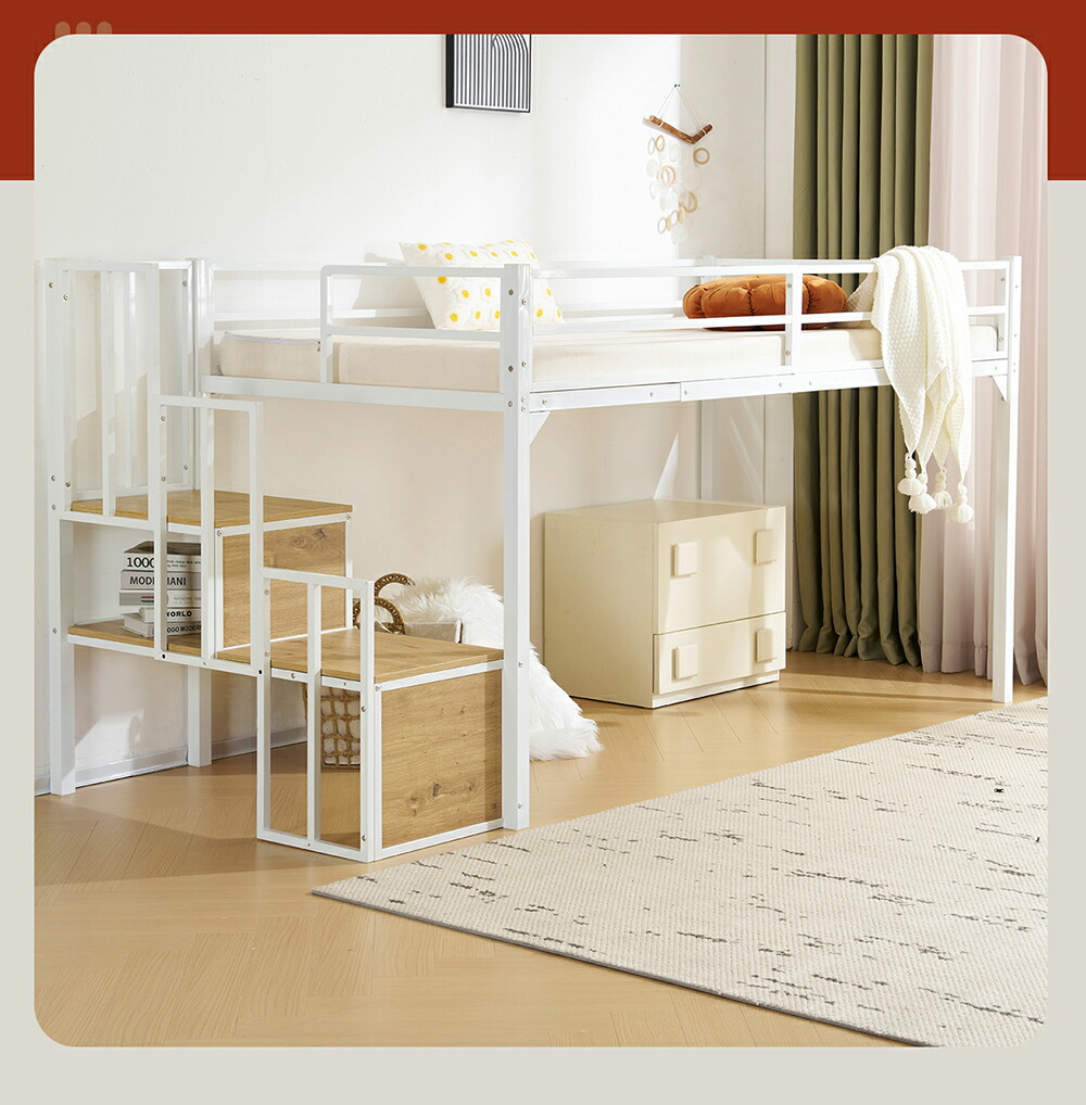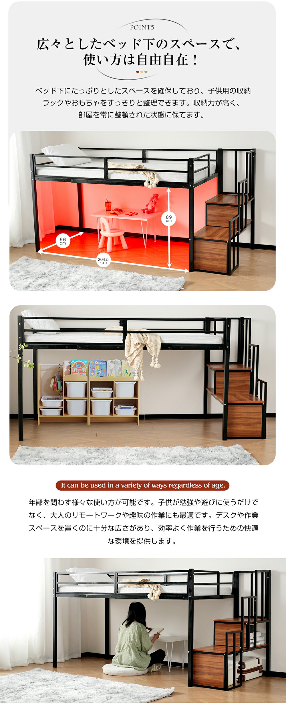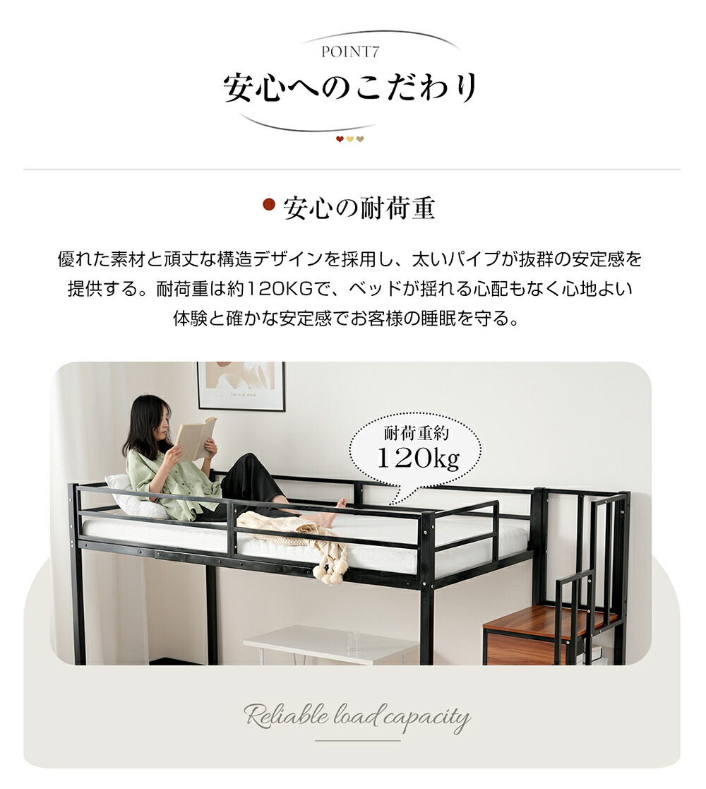 ロフトベッド パイプベッド 階段付き シングル セミダブル ブラック ホワイト