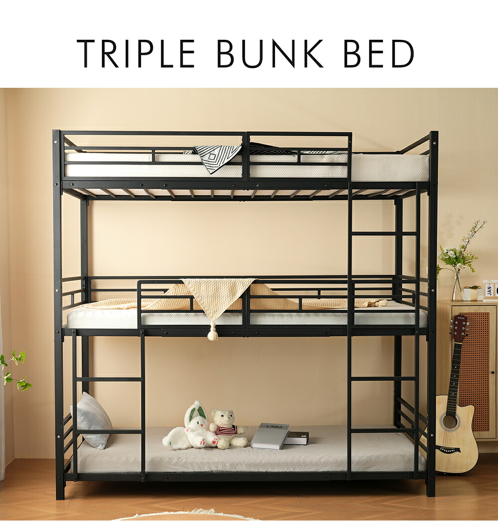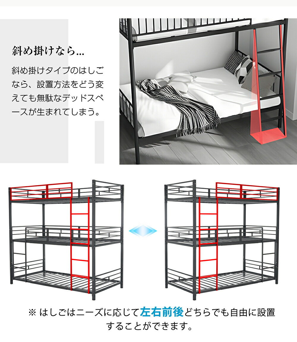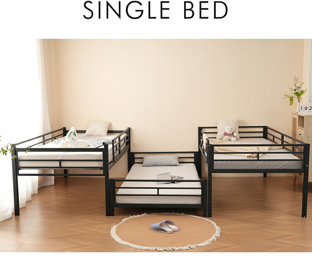 三段ベッド 子供 パイプ 大人用 シン ブラック ホワイト