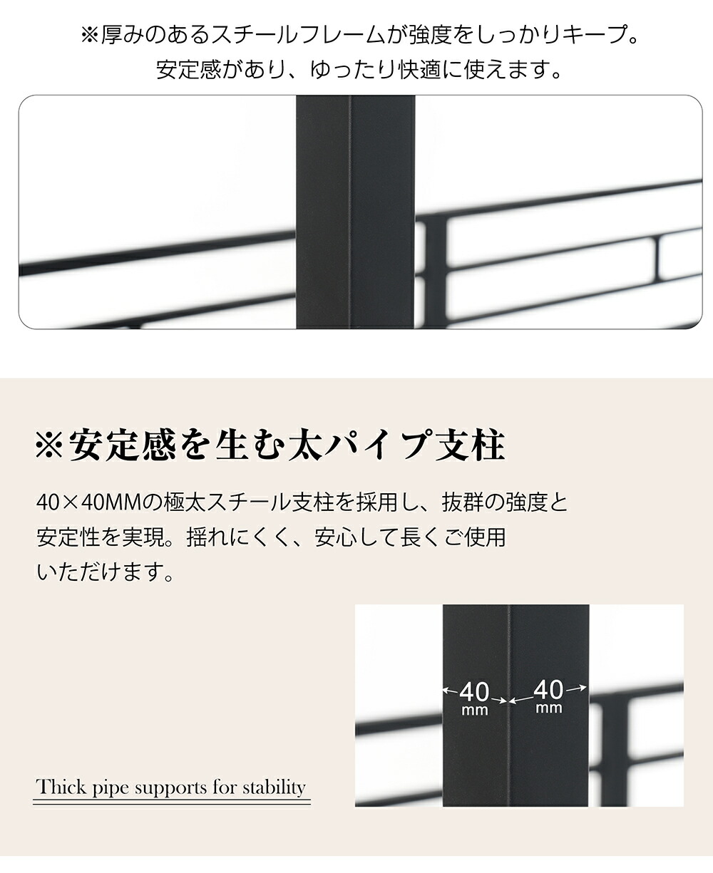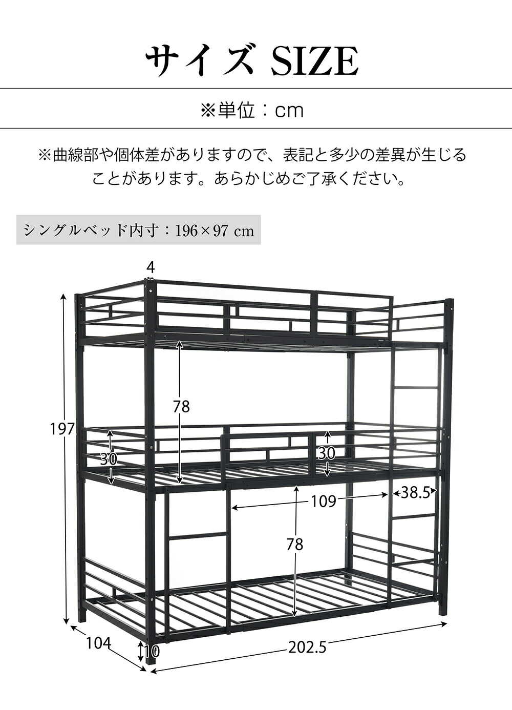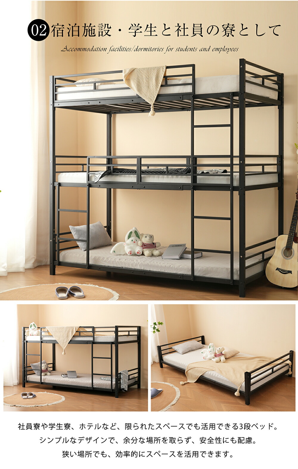 三段ベッド 子供 パイプ 大人用 シン ブラック ホワイト