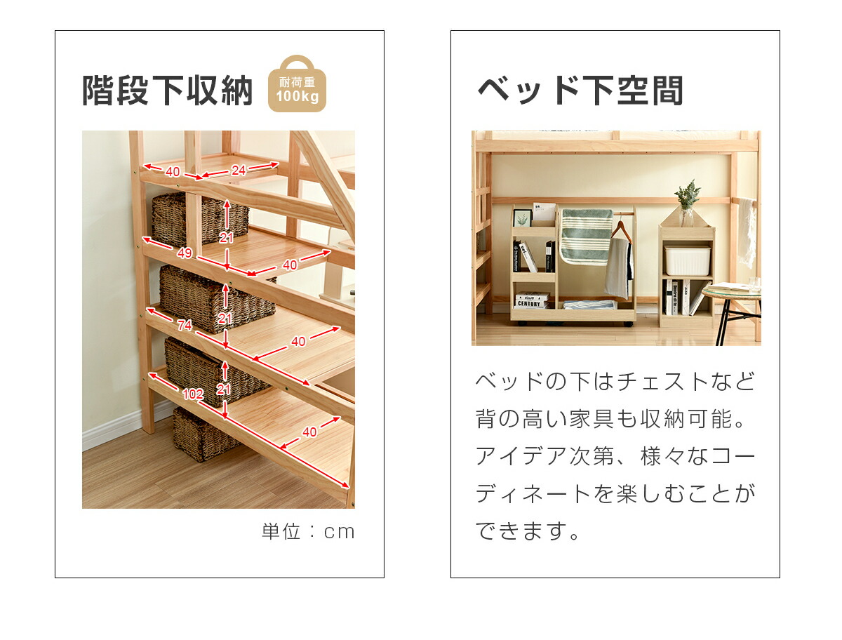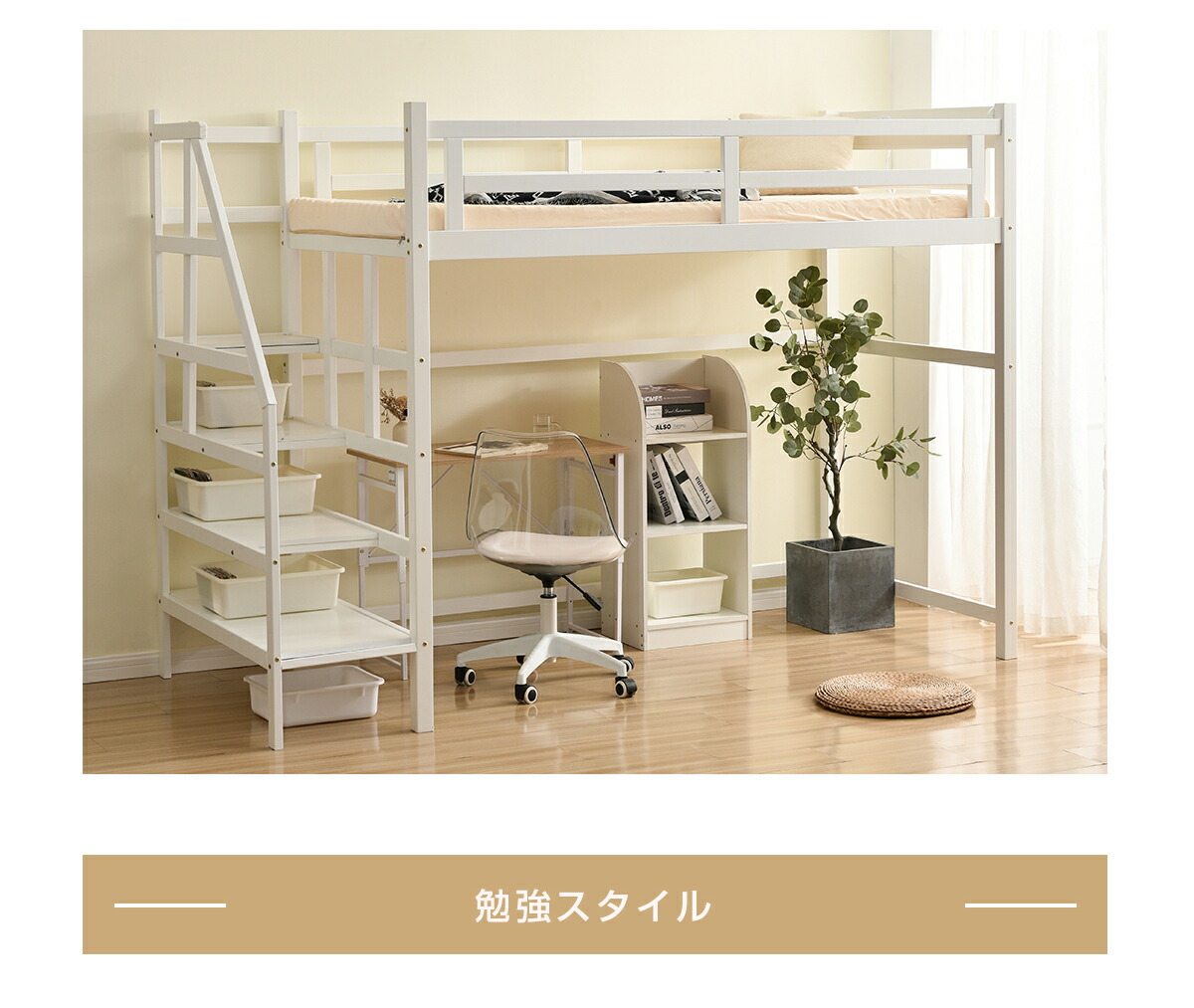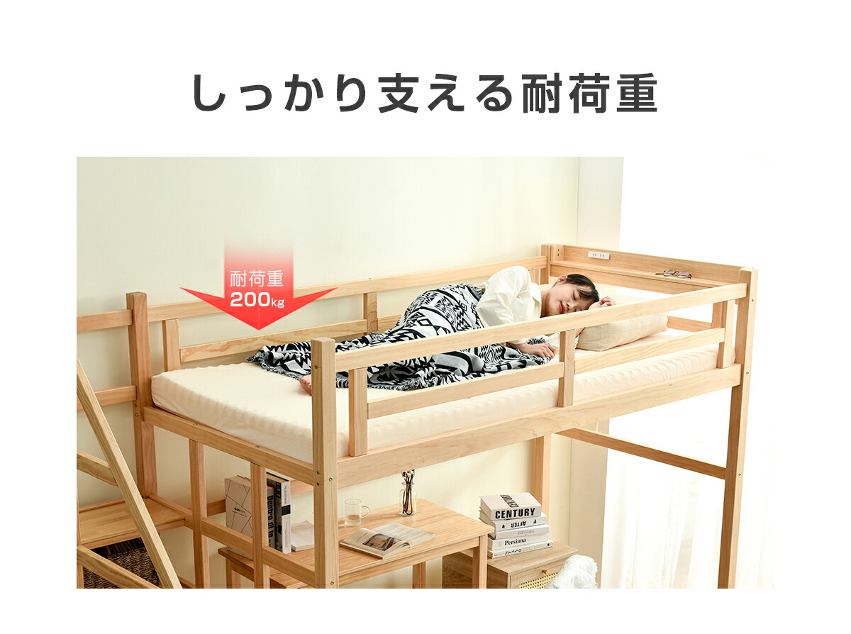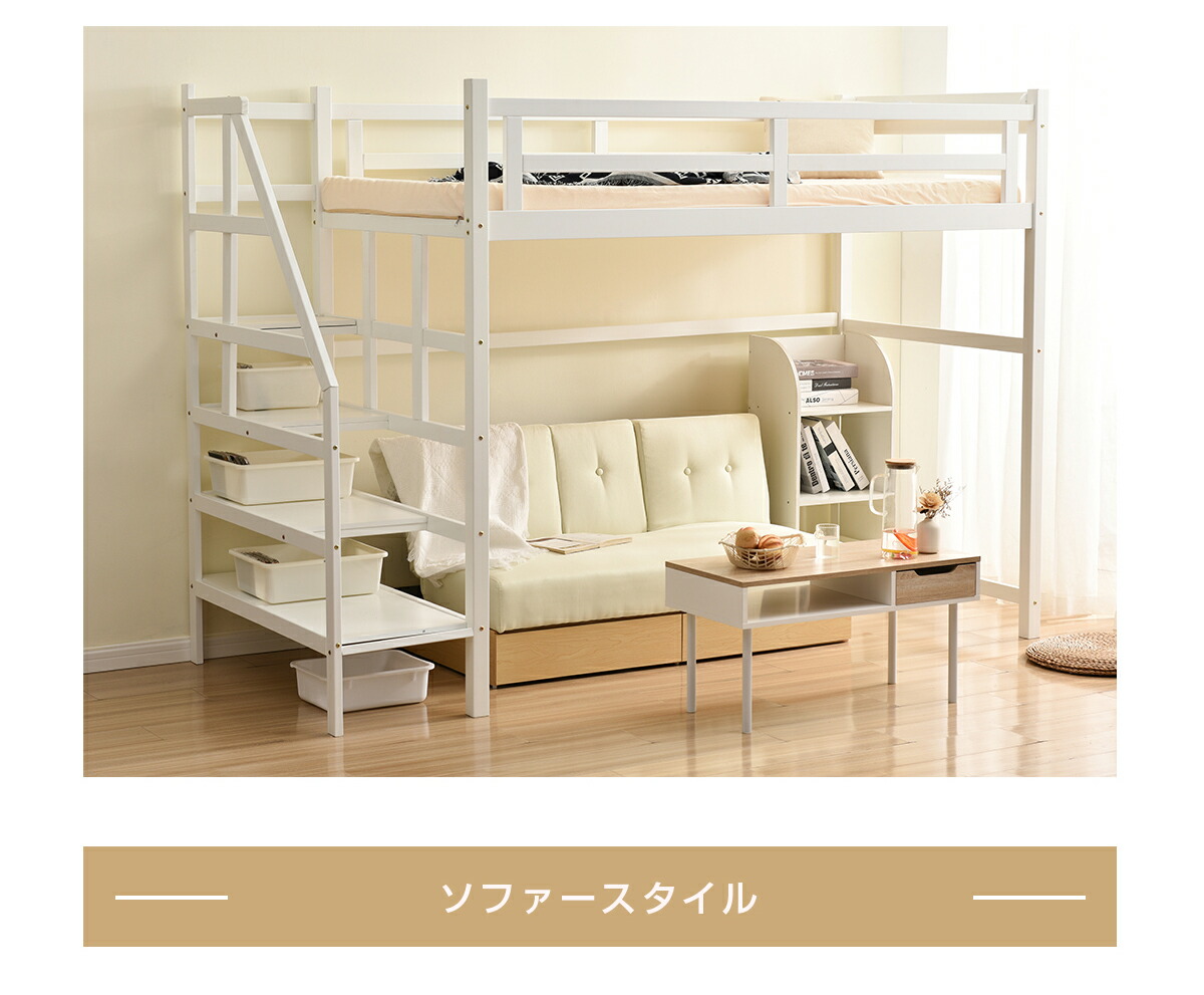 ロフトベッド 階段付き 宮付き 収納棚 ナチュラル ホワイト