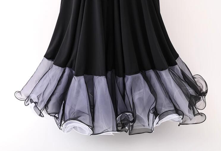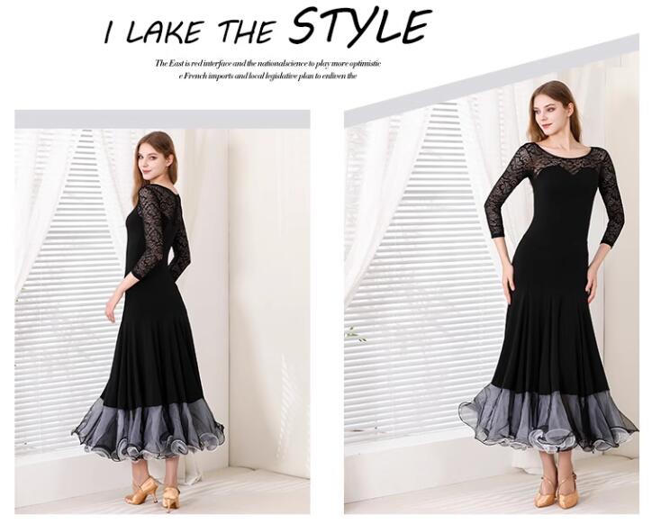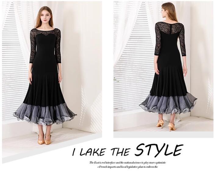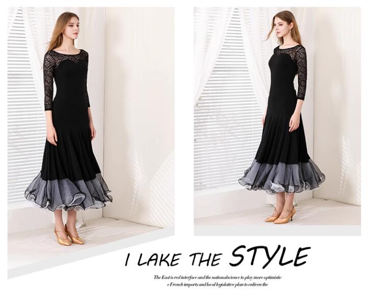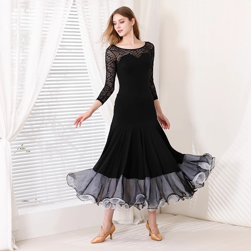 社交ダンスドレス ラテンドレス レース 透け感 セクシー 袖あり 黒 発表会ドレス 大きい裾 社交ダンス衣装 ダンスウェア スタンダードドレス 競技ドレス ワルツ サンバ ラテンダンス 団体ウ ルンバ