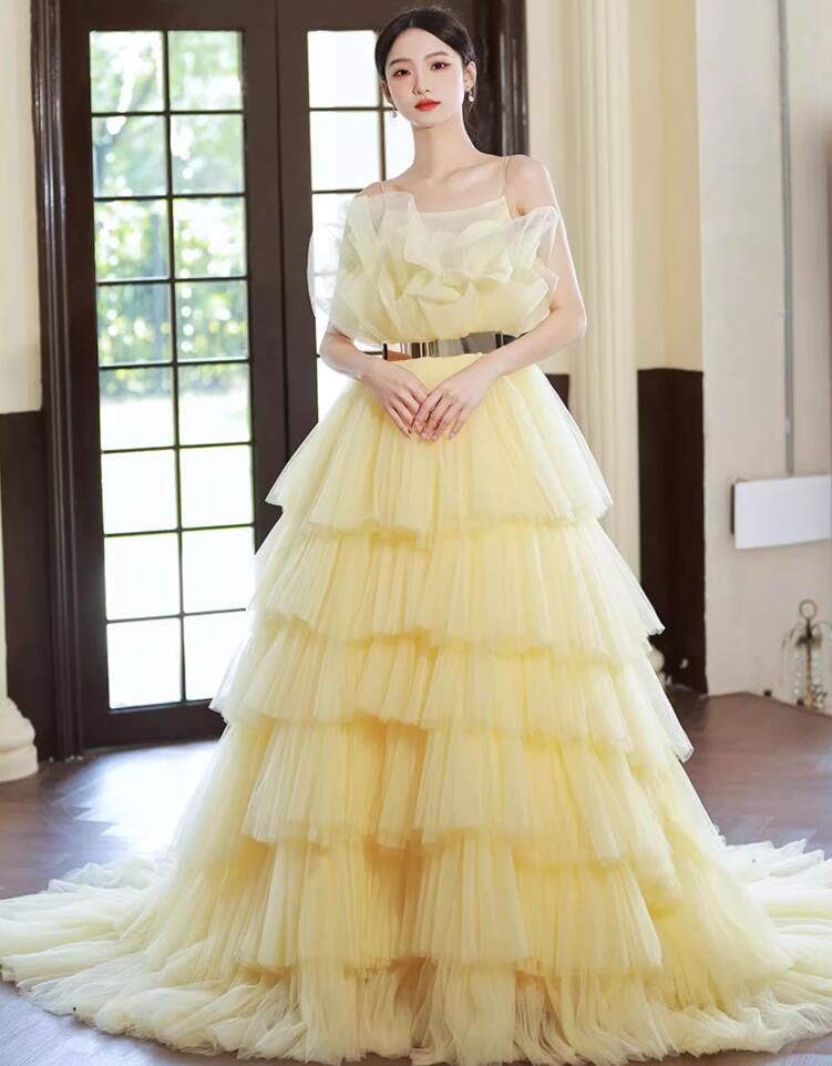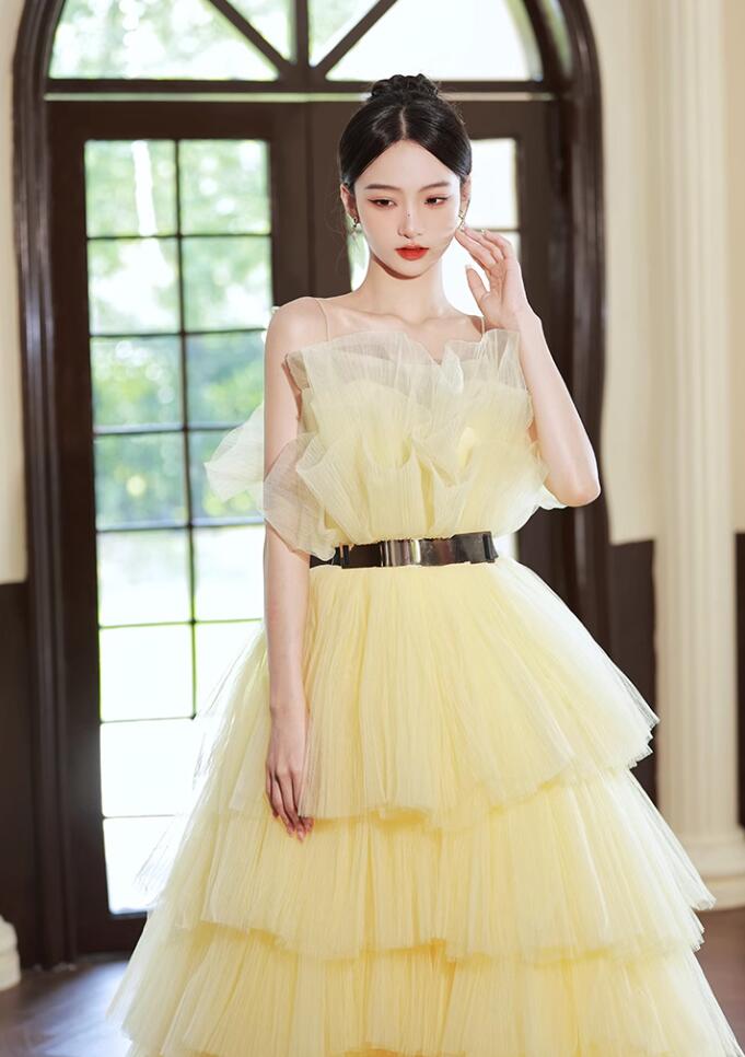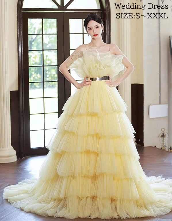 ウェディングドレス 花嫁ドレス カラードレス 黄色 演奏会 お姫様ドレス 高級感 多重チュール 結婚式 前撮り フォトウェディング撮影 ロングドレス 編み上げ パーティードレス 二次会 披露 きれいめ