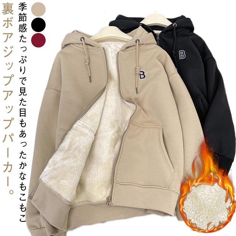 秋 ゆったり ボアパーカー もこもこ パーカー レディース 裏起毛 裏ボア 厚手 フード付き ジップパーカー 無地 ふわふわ 冬 アウター 防寒 保温 極厚 裏起毛パーカー ジップアップパー あったか