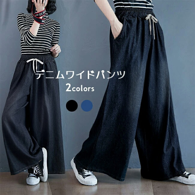 デニム レディース ジーンズ ストーンウォッシュ ワイドパンツ 極太 デニムワイドパンツ ジーパン バギーパンツ お洒落 体型カバー ロングパンツ ウエストゴム ブラック ワイドジーンズ ワイ ブルー