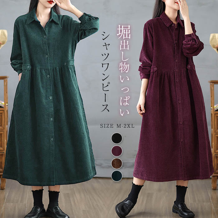 ロングワンピース レディース 春秋 冬 ワンピース コーデュロイ 長袖 キレイめ 前開き ロングシャツワンピース スタンドカラーシャツワンピース ゆったり ミモレ丈 アウター 体 カジュアル