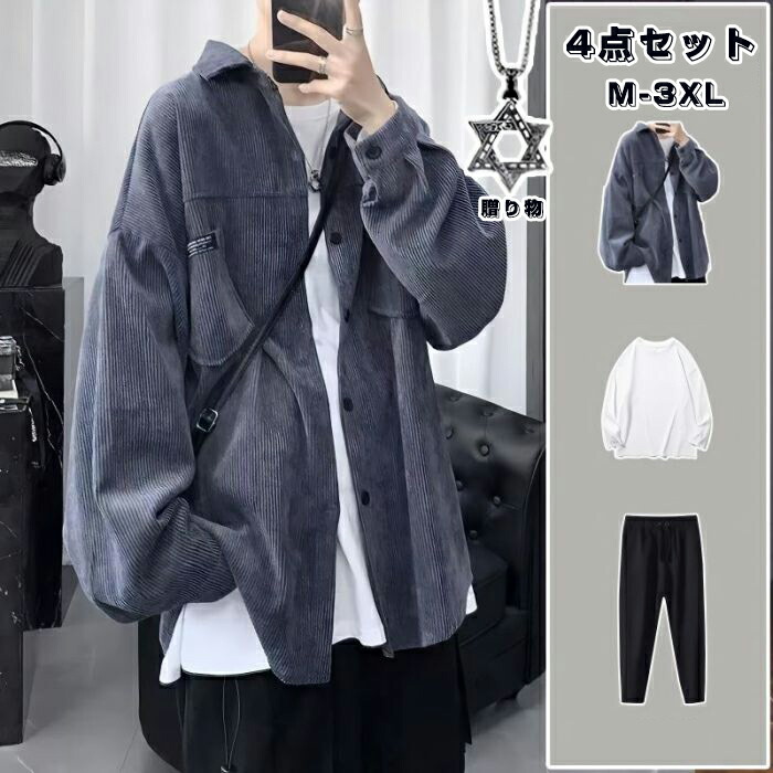 セットアップ 韓版 メンズ かっこいい 上下4点セット 港風 春と秋 ゆったり 百掛け コーデュロイ 長袖 上下セット ジャケット シャツ パンツ ネックレス トップス ハーフ 無地 Tシャツ