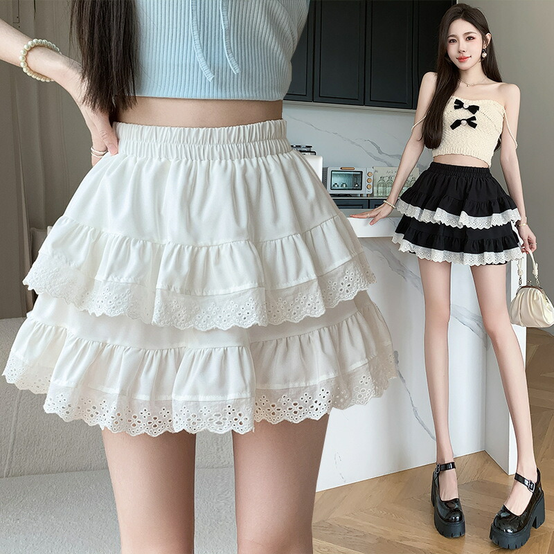 スカート レディース ロング フリルレース ミニスカート プリーツ aライン ハイウエスト ゴム おしゃれ 春秋 夏 きれいめ お洒落 可愛い ゆったり