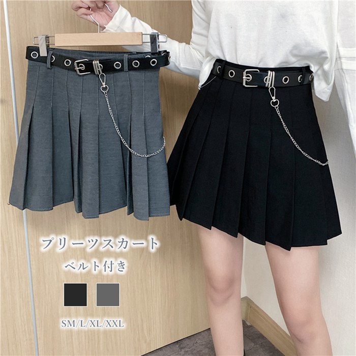 チェーン付き プリーツスカート ベルト付き ミニスカート 黒 ブラック グレー ハイウエスト 小さいサイズ 大きいサイズ 春夏 レディース ミニ スカート セクシー 超可愛い制服 コスプレ プリーツ