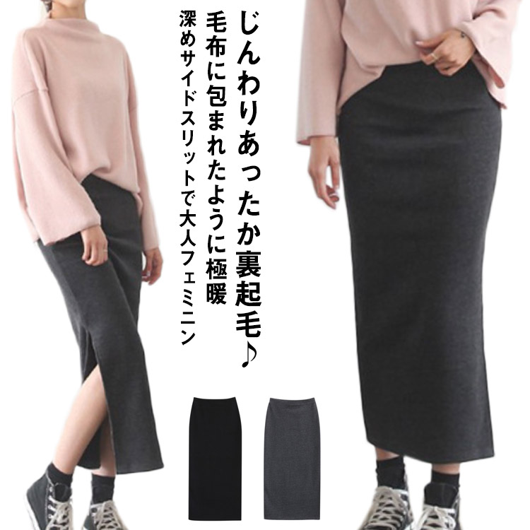 大人っぽいフェミニンなロング丈スカート 厚手 秋冬 裏ボア スカート タイトスカート 細身 韓国ファッション サイドスリット 裏シャギー 冷え対策 寒さ対策 オフィス 通勤