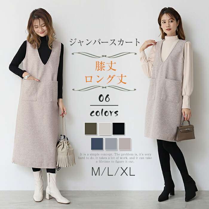 ジャンパースカート 大人 vネック ジャンスカ ワンピース ロングワンピース 深めvネック 膝丈 春秋 冬 無地 シンプル ゆったり カジュアル フォーマル 通学 通勤 重ね着 マタニティ