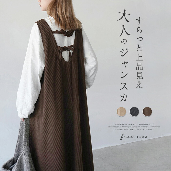 大人 コーデュロイ ワンピース 秋 ロングワンピース レディース タンクワンピース ミモレ丈 フレアワンピース バックリボン オールインワン オーバーオール 重ね着 ゆったり 体型カバー き 森ガール