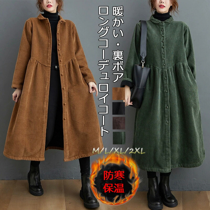 ロングコーデュロイコート 裏ボアコート ジャケット 冬 トップス ブラック グリーン キャラメル コーヒー コーデュロイ ロング 厚手 裏起毛 暖か 大人可愛い ゆったり 30代 40代 50代