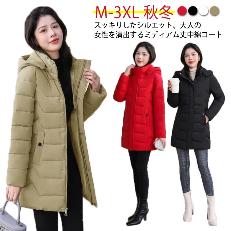 中綿 コート レディース ダウンコート ミドル丈 スリム フード付き 軽量 防寒コート 秋冬 アウター ロングコート 冬コート 防寒 保温 あたっか 無地 細身 着 きれいめ 大人 カジュアル せ