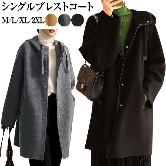 シングルブレスト フードコート アウター 秋冬 ウール シンプル レディース ~2