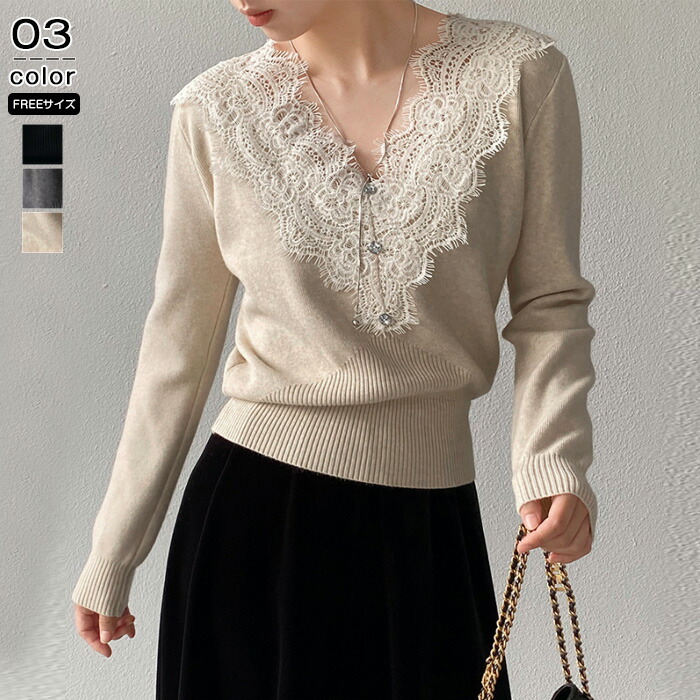 ニットセーター レディース Vネック 襟レースデザイン 花柄 きれいめ 上品 ニット ニットインナー トップス 長袖 セーター 長袖セーター プルオーバー ニットソー 秋 冬 ショート インナー