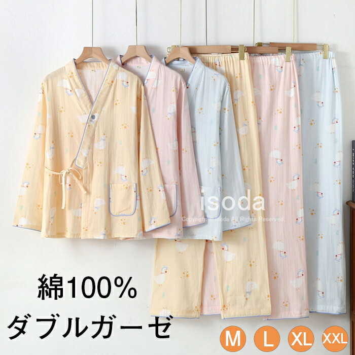 パジャマ 綿100% ダブルガーゼ レディース 和風 長袖 前開き 春 夏 ルームウェア コットン 上下セット ロングパンツ 可愛い Vネック 部屋着 ナイトウェア 大人 無地 おし ガーゼ