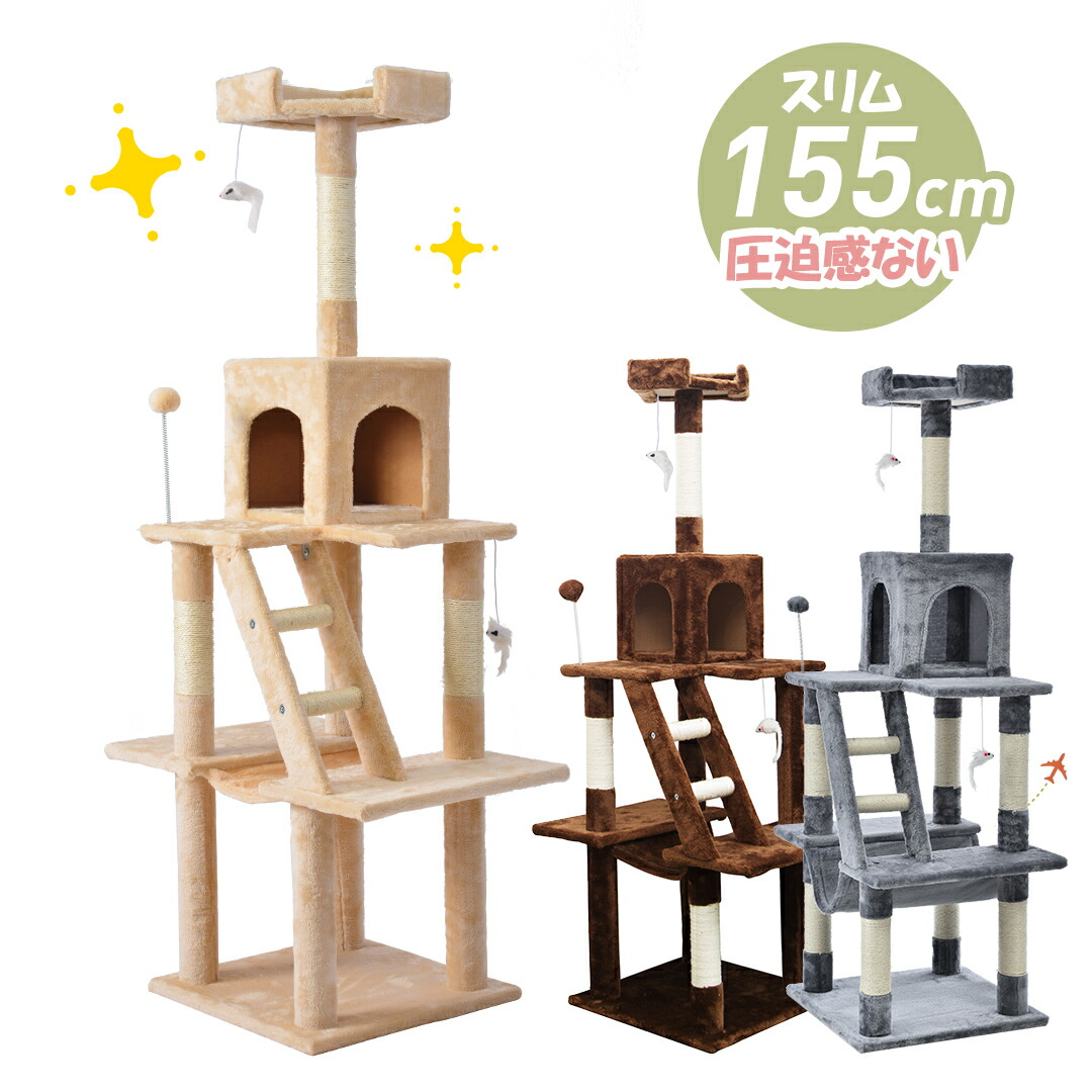 キャットタワー ハンモック付き 据え置き シニア 省スペース 全高155cm 麻紐 おしゃれ ネズミおもちゃ2本付き 爪とぎ 猫タワー ペット用品 ボンボンおもちゃ付き