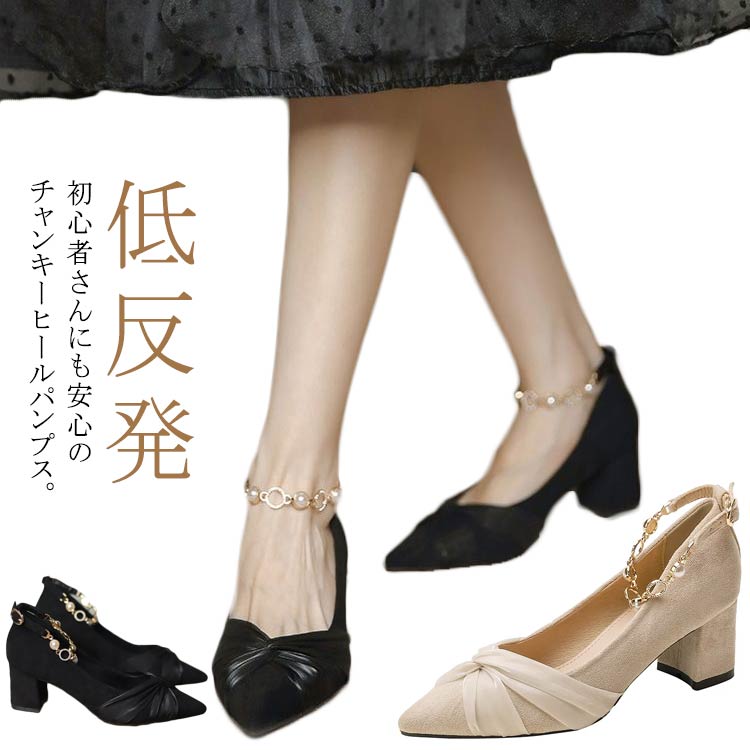 パンプス 結婚式 パーティー 入学式 チャンキーヒール フォーマル ストラップパンプス ポインテッドトゥ 大きいサイズ 小さいサイズ パールベルト フロントタイ 黒 痛くない 疲れにくい エ ベージュ