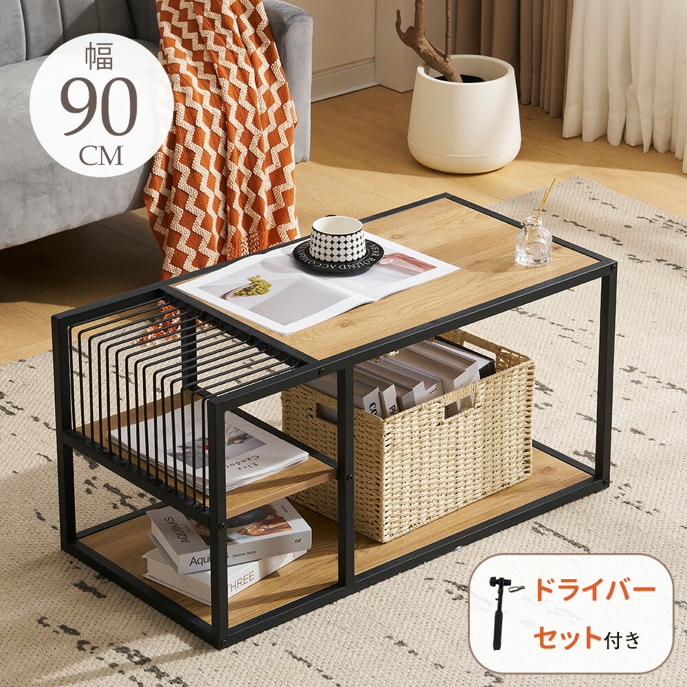 センターテーブル 幅90 木目調 収納棚付き スチール 組立簡単 棚付き マガジンラック付き おしゃれ スチール脚 頑丈構造 一人暮らし 引っ越し準備 ワンルーム向け 新生活