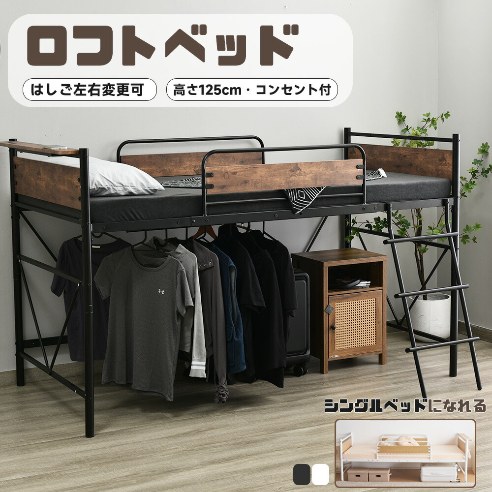 ロフトベッド 高さ125cm シングル パイプベッド コンセント付き ハイベッド 宮 ロータイプ 下収納 耐荷重150kg 大人用 子供部屋 子供ベッド パイプ スチール 頑丈 ベッド